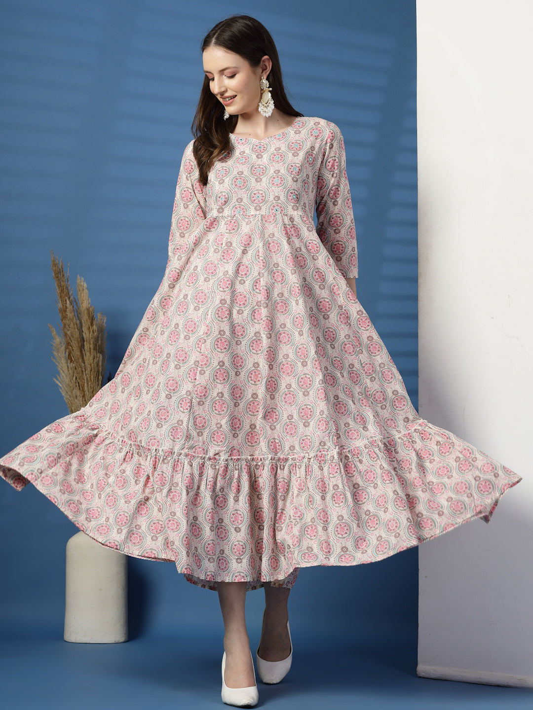 The flowy Anarkali silhouette drapes beautifully, while the 3/4 sleeves offer a refined and comfortable fit. Perfect for festive gatherings, family functions, or casual outings, this dress blends ethnic charm with everyday ease.