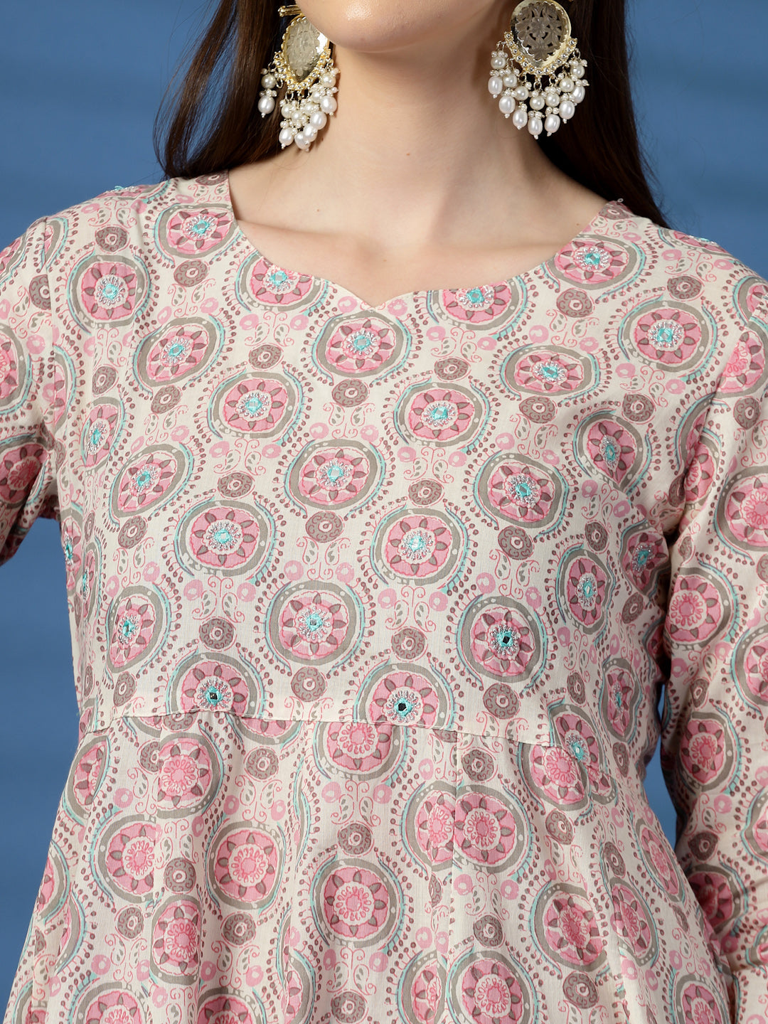Step into timeless elegance with this Elegant Beige Anarkali Dress with Printed & Threadwork Detailing. Crafted from soft, breathable cotton, this dress features beautiful printed patterns enhanced with delicate threadwork and mirror detailing, adding a graceful traditional touch.