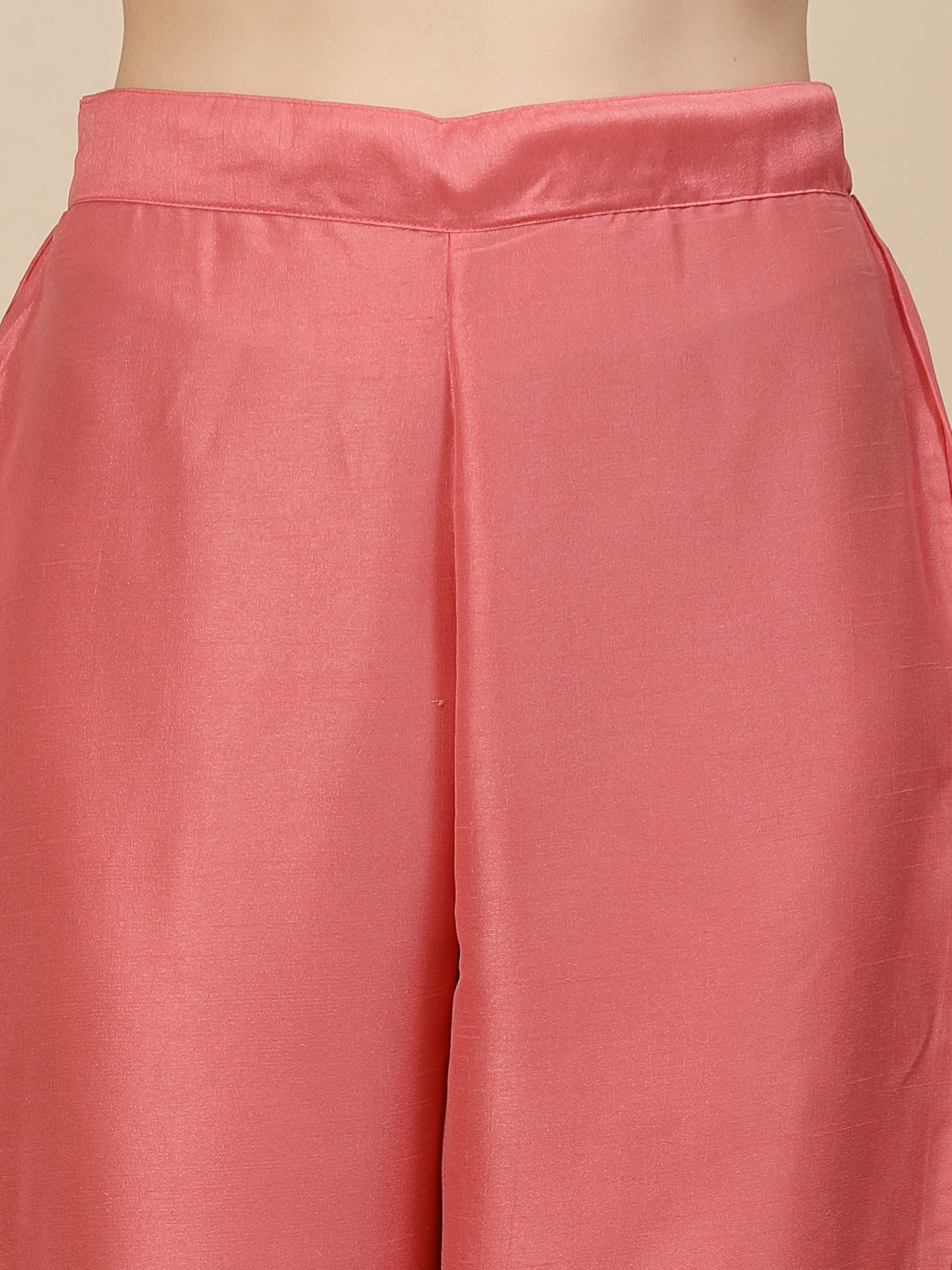 Elevate your ethnic wardrobe with this Women Peach-Coloured Mirror Work Embroidered Anarkali Kurta & Trousers with Dupatta. Crafted from luxurious silk fabric, this elegant kurta set offers a graceful drape and a refined festive look.