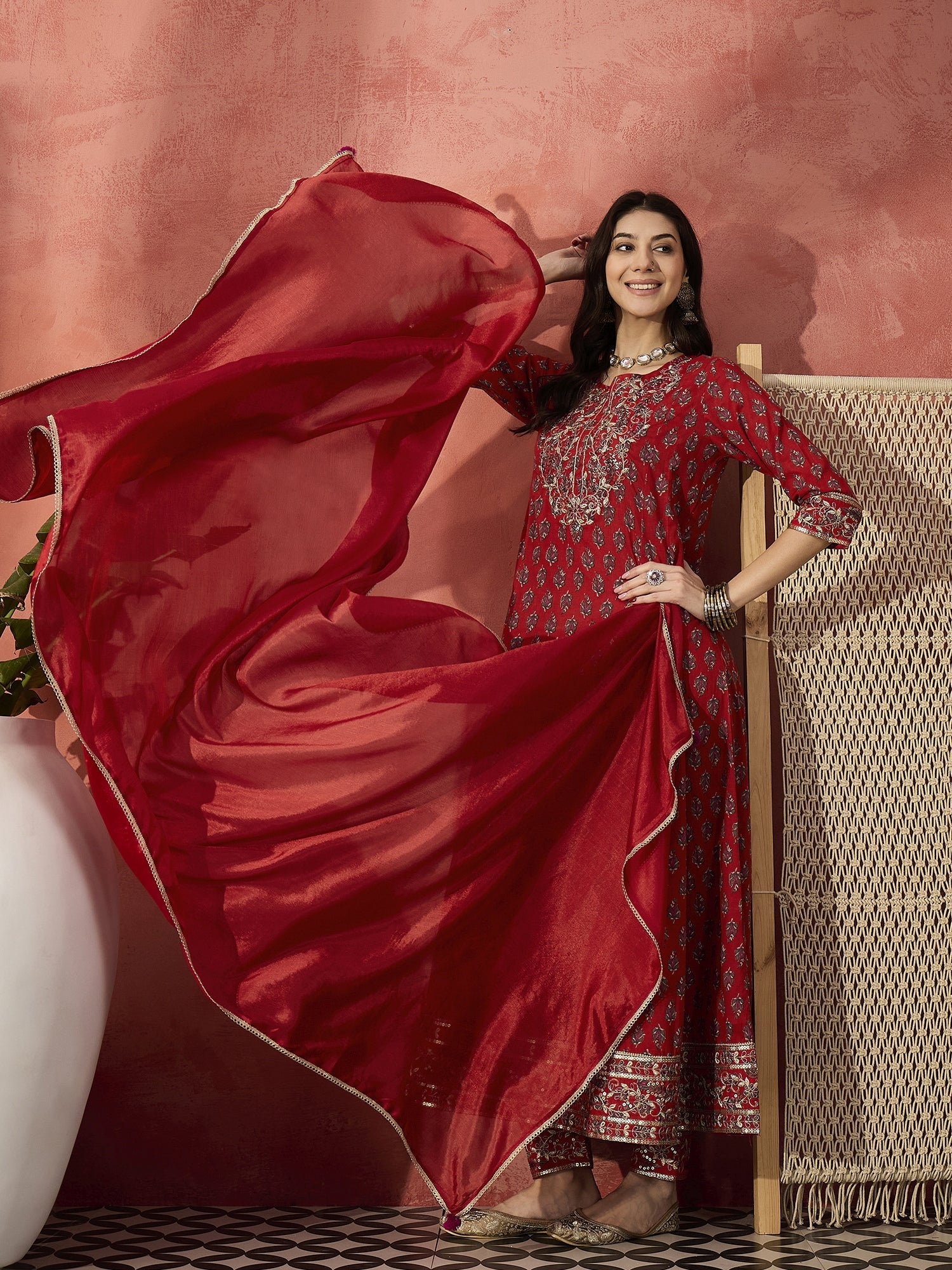 Step into timeless elegance with this Red Cotton Anarkali Kurta Set. Featuring intricate embroidery and a flowy silhouette, it’s perfect for festive occasions. Paired with a matching bottom and chiffon dupatta for a graceful finish.