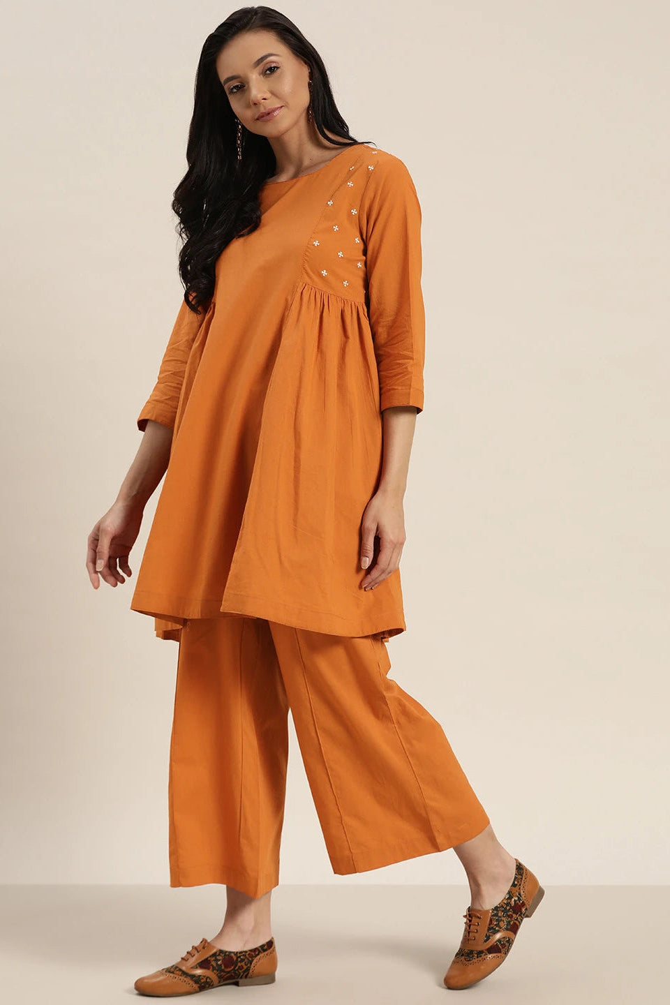 Key Features• Women rust embroidered co ord set• Elegant A line kurta silhouette• Matching comfortable palazzo pants• Soft and breathable cotton fabric• Three quarter sleeves styling• Ideal for festive and casual wear• Comfortable traditional modern look