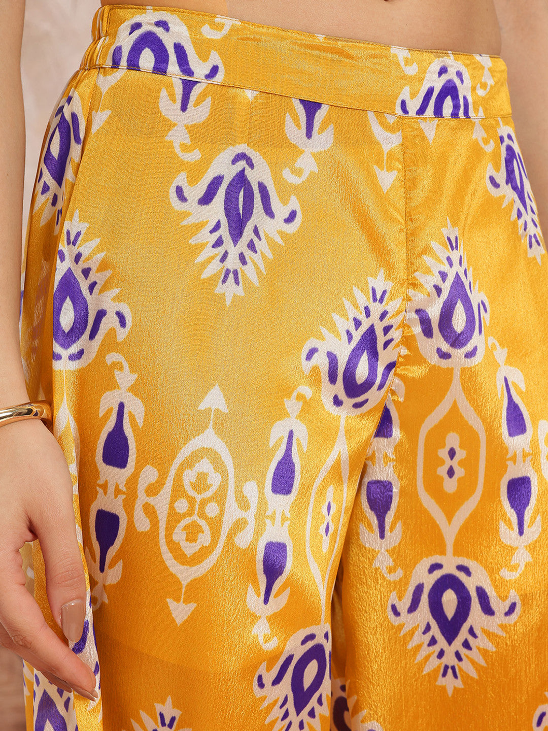 Upgrade your wardrobe with this women yellow printed top palazzo set crafted in soft chinnon fabric. Designed with a flowy silhouette and elegant print, it offers comfort and style, making it ideal for festive occasions, casual outings and everyday wear.
