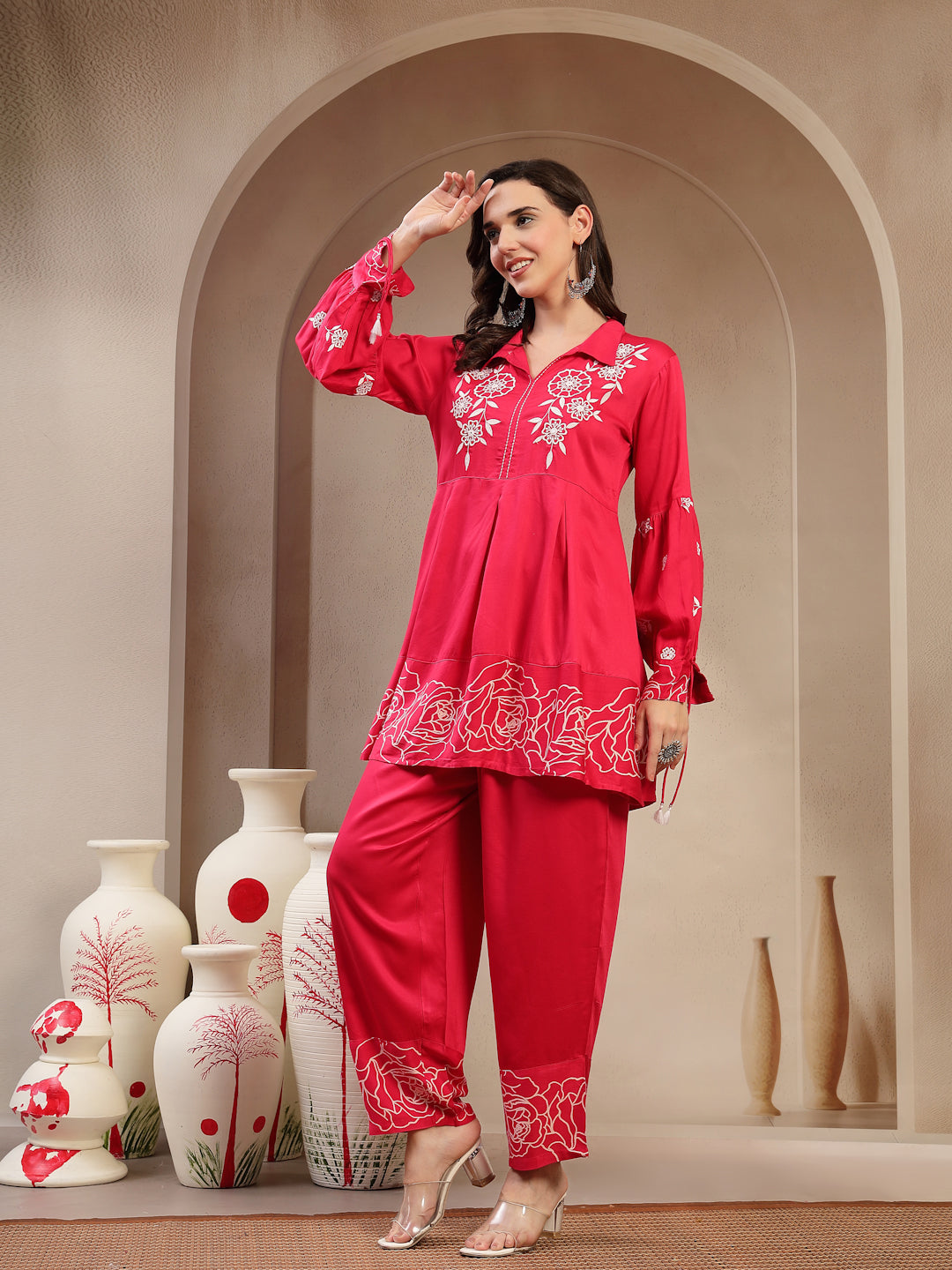 The kurta features a smart shirt-collar neckline that adds a tailored edge to its relaxed silhouette, while full-length sleeves enhance its polished look. Paired with flowy palazzo trousers, this co-ord set delivers relaxed sophistication—ideal for moments when you want to look stylish without compromising on comfort.