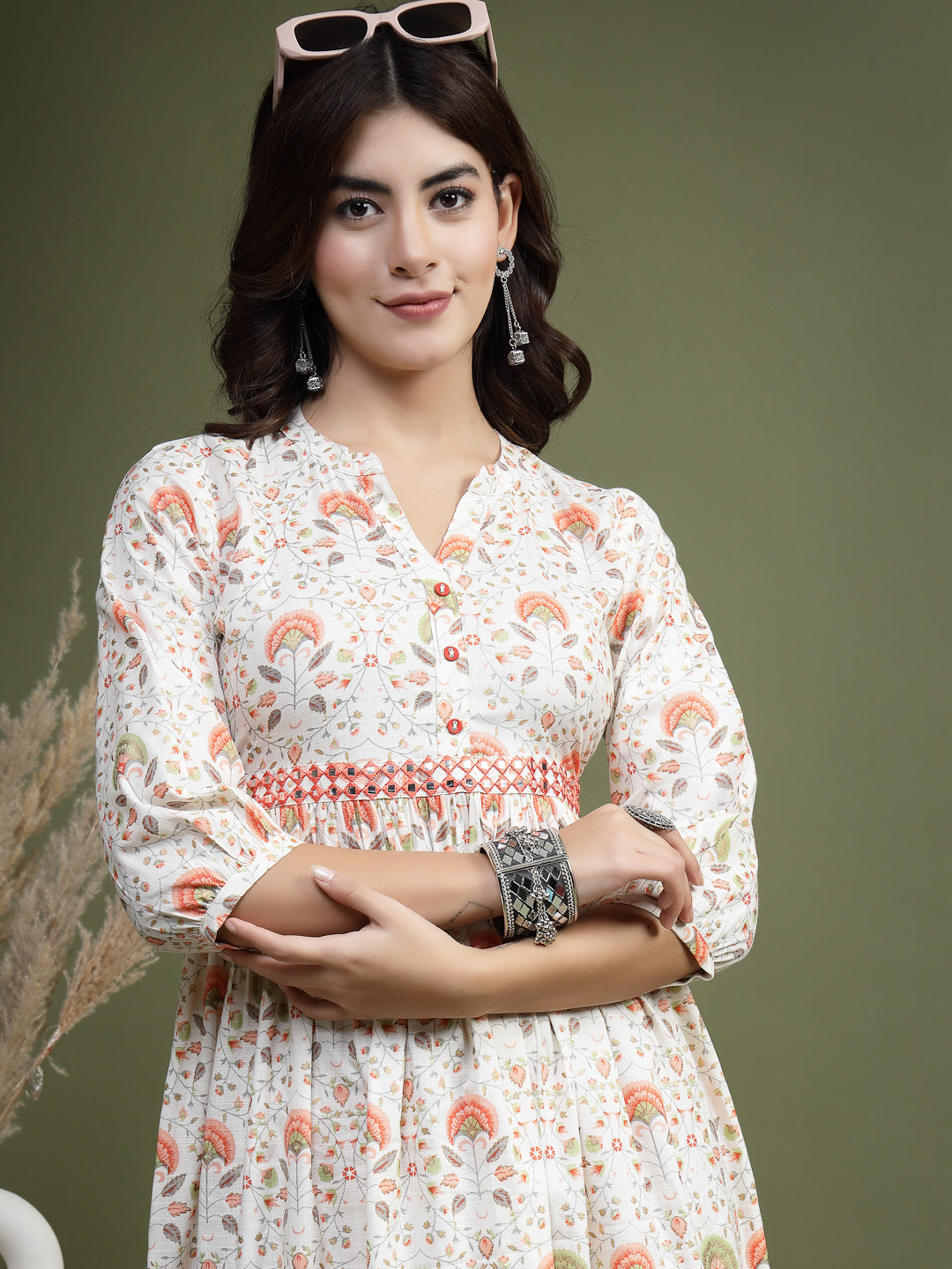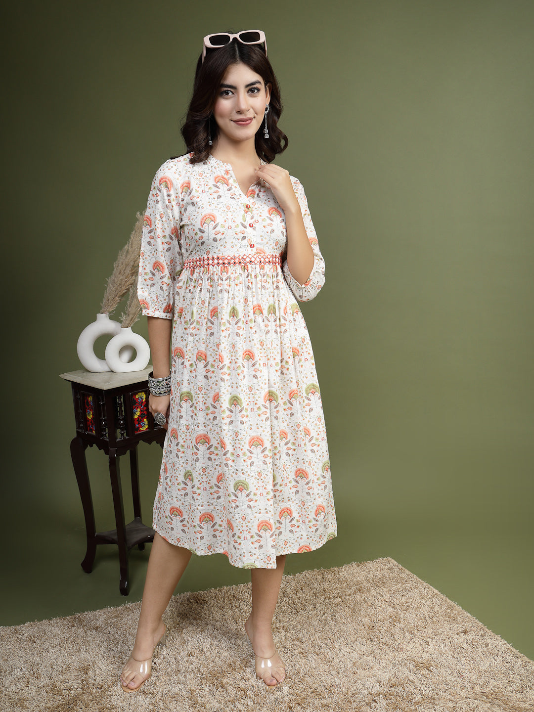 Designed in a flattering fit & flare (A-line) silhouette, it features delicate floral prints, subtle mirror work detailing, and half sleeves for a chic and balanced look. Perfect for brunches, casual outings, and festive moments, this midi dress blends everyday comfort with timeless ethnic style.