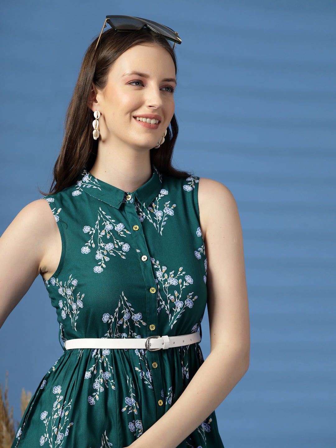 The vibrant green base enhanced with delicate floral prints brings freshness and elegance to your look. Designed with a flattering flowy midi-length silhouette and a structured shirt collar neckline, this dress drapes beautifully and offers effortless movement. A versatile addition to your wardrobe, perfect for day-to-evening styling.