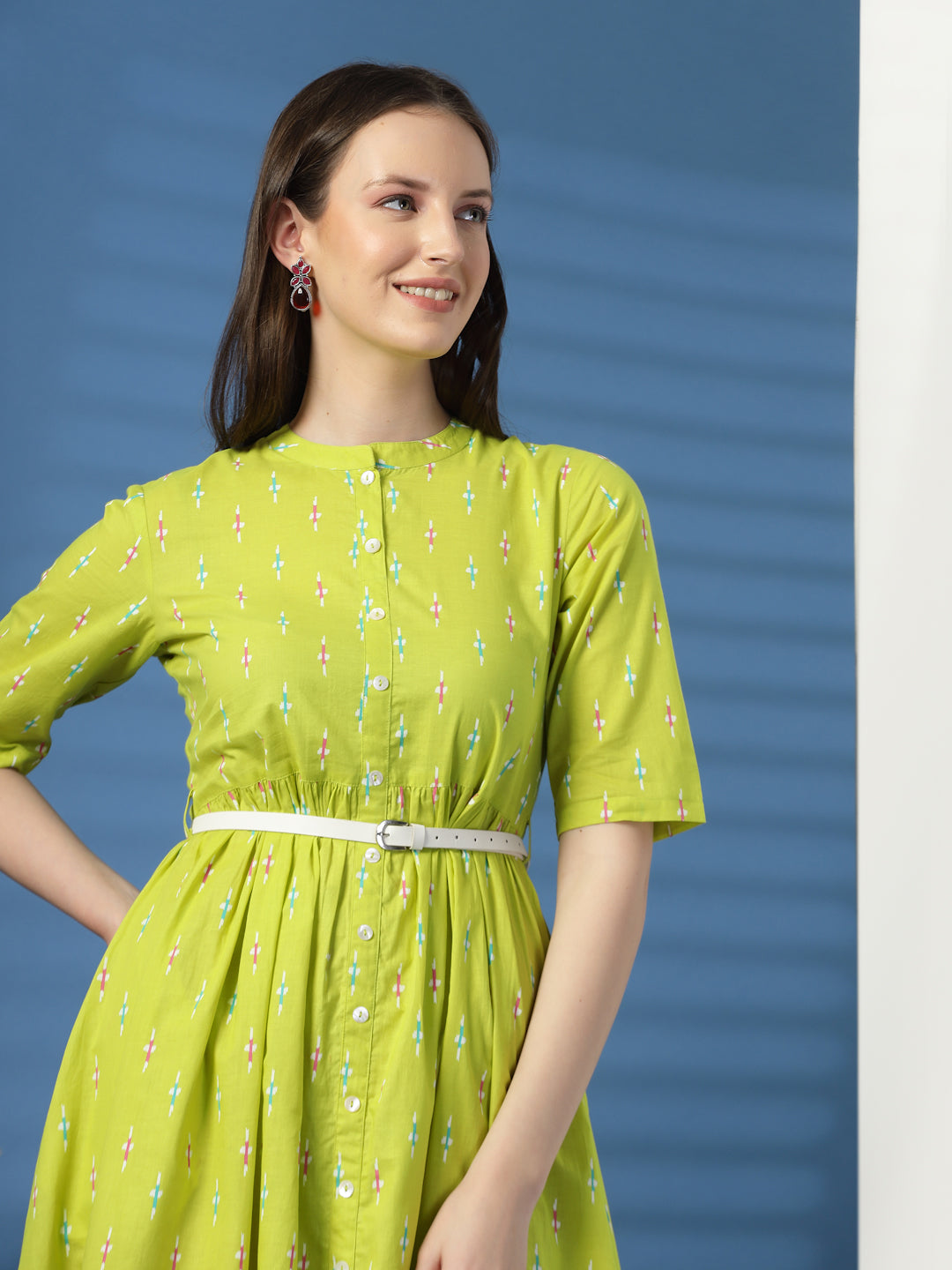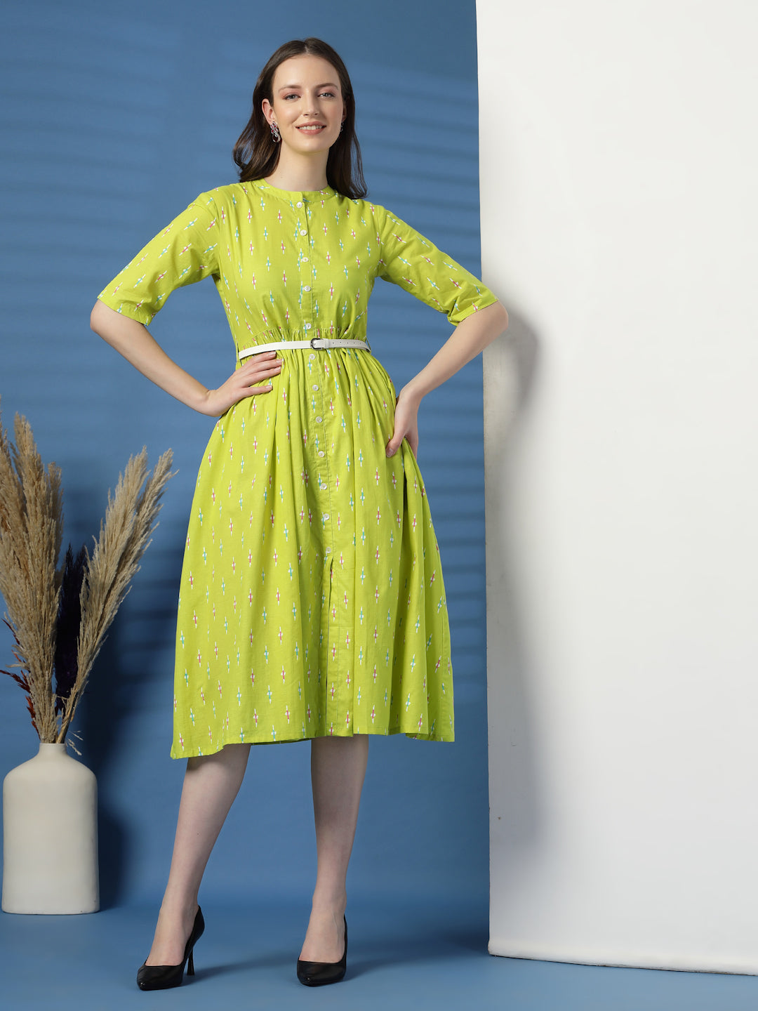 Brighten up your everyday wardrobe with this Women Lime Green Printed Fit and Flare Dress, crafted from soft and breathable cotton fabric for all-day comfort. The refreshing lime green hue paired with graceful prints adds a lively and stylish touch, making it an easy choice for work, brunch dates, and casual outings.