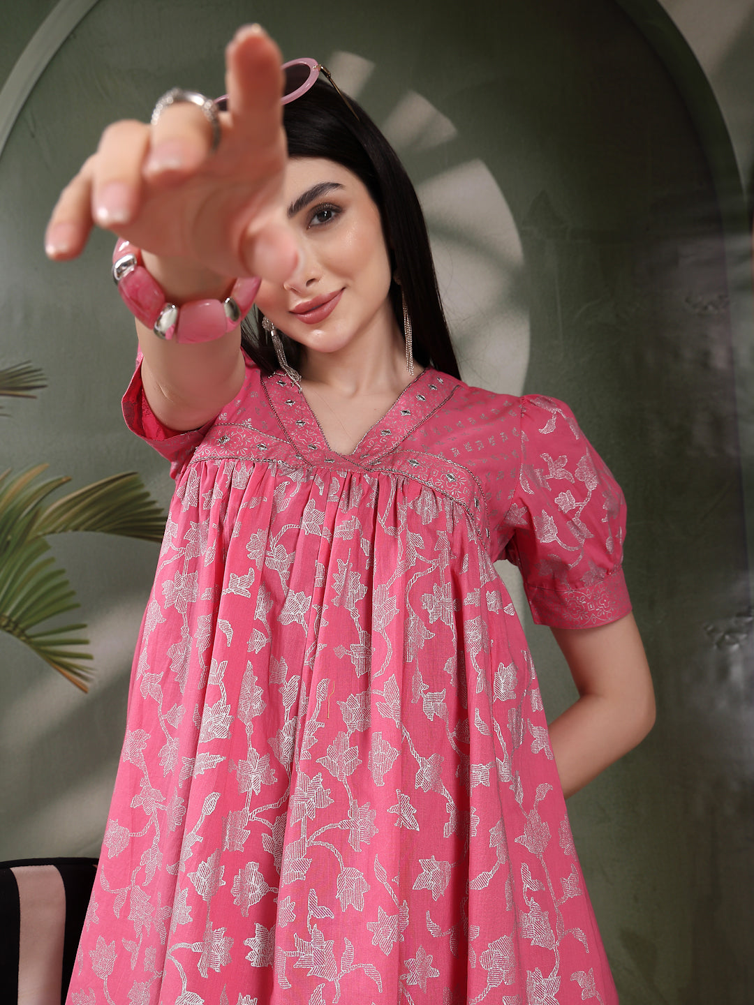 Step into effortless elegance with this Women Blue Motif Printed Cotton Ethnic Dress, crafted from soft and breathable cotton for all-day comfort. The delicate motif prints add a graceful ethnic charm, making it a perfect choice for casual outings, festive moments, and daytime events.