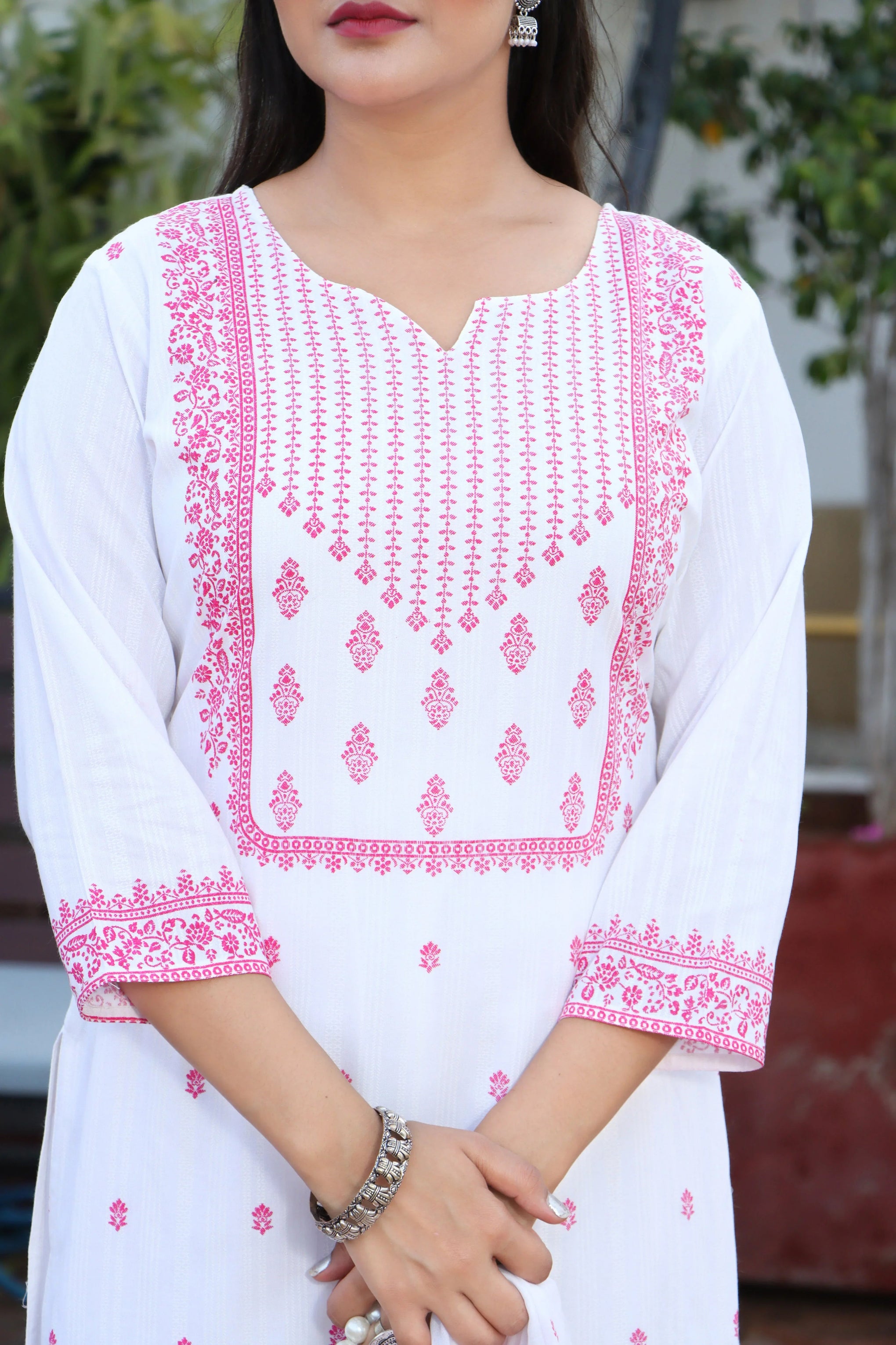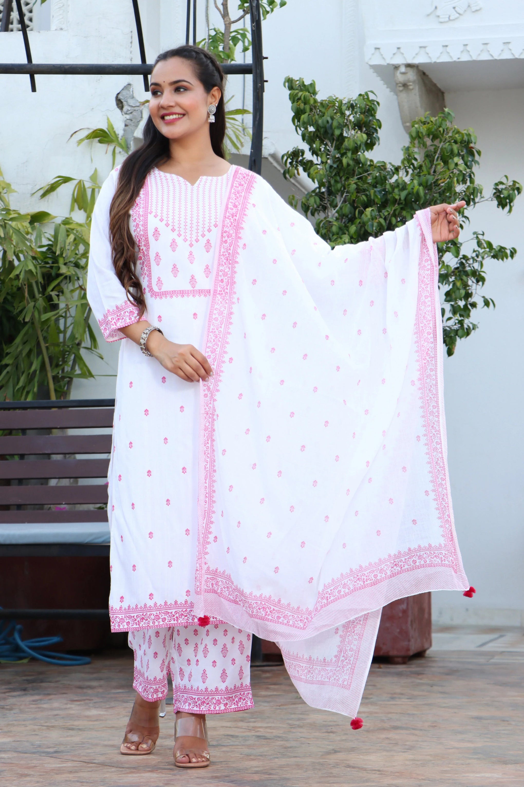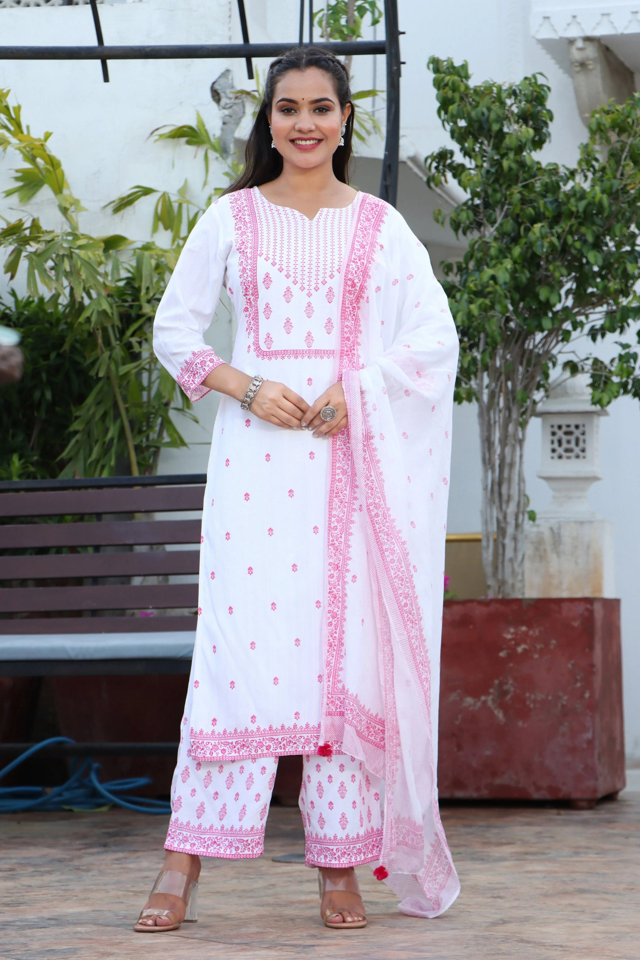 Add a touch of elegance to your ethnic collection with this Women’s White & Pink Ethnic Motifs Printed Straight Kurta Set. Made from soft and breathable rayon fabric, the kurta and trousers provide a comfortable fit for all-day wear. The kurta features a stylish V-neckline and 3/4th sleeves, beautifully highlighted with traditional pink ethnic motif prints that enhance its graceful appeal. The set is completed with a matching rayon trouser and a lightweight cotton dupatta, creating a coordinated and refined ethnic look. Perfect for daily wear, office wear, casual outings, and light festive occasions, this straight kurta set blends comfort with timeless style.