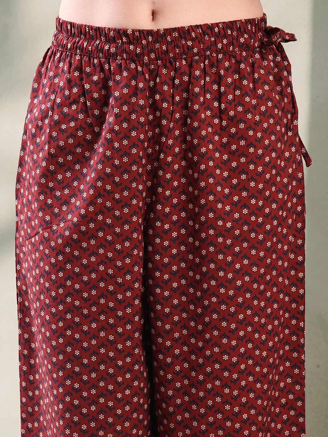 Add timeless charm to your ethnic wardrobe with this girl maroon embroidered kurta palazzo set. Designed with a round neck, cut sleeves and elegant all-over embroidery, this comfortable kurta set comes with a matching palazzo, ideal for festive occasions, casual outings and everyday ethnic wear.