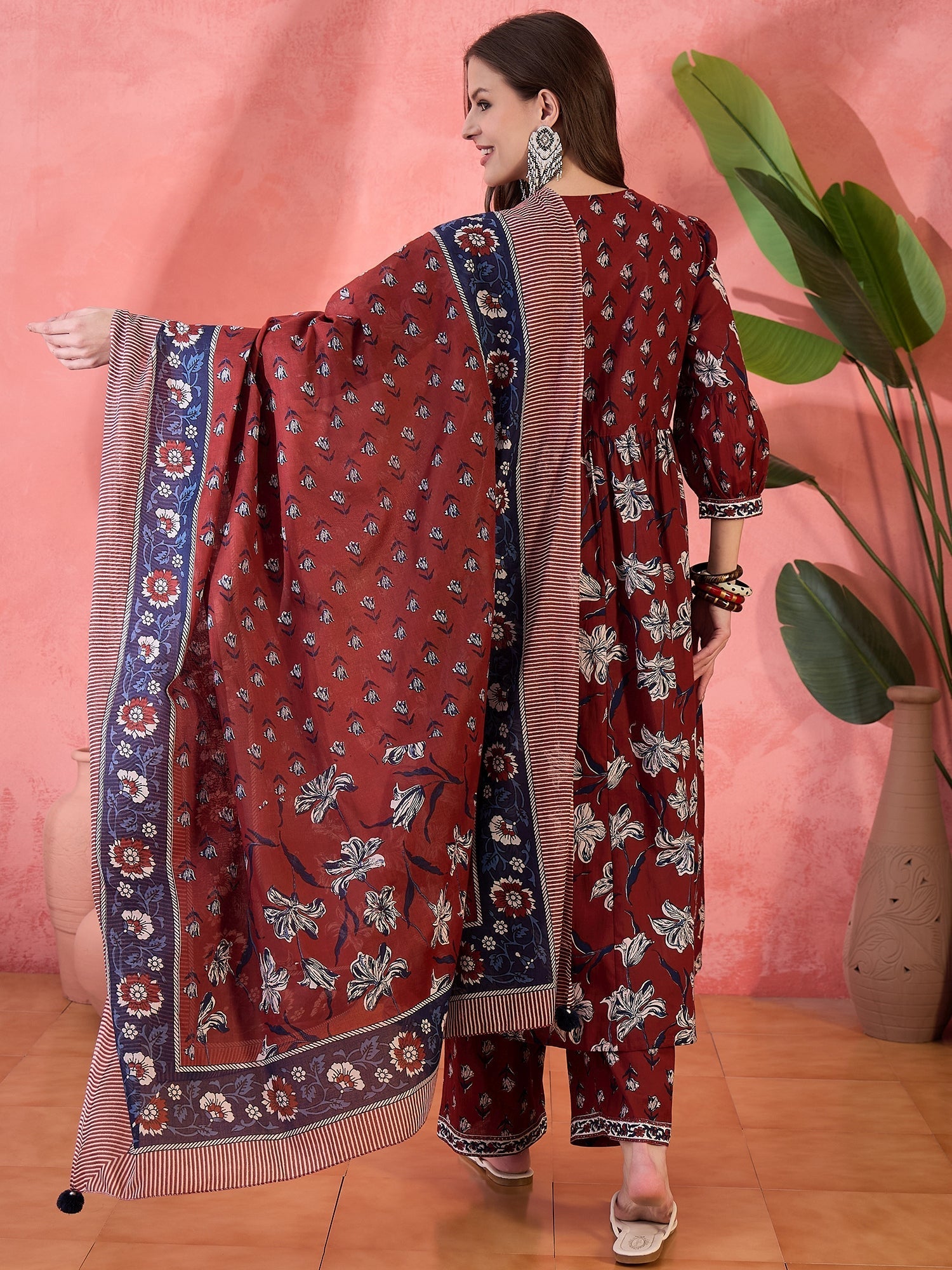 Make a statement with this elegant Women Maroon Printed Pure Cotton Kurta, Palazzos & Dupatta Set, crafted for women who love comfort with timeless ethnic style. Made from soft and breathable pure cotton fabric, this kurta features a graceful Aliya cut silhouette with beautiful all-over prints that enhance its traditional charm. The flattering V-neckline adds a refined touch, while the flowy design ensures effortless movement and comfort. Paired with matching cotton palazzos and a coordinated dupatta, this ensemble is perfect for festive occasions, casual gatherings, and ethnic celebrations.