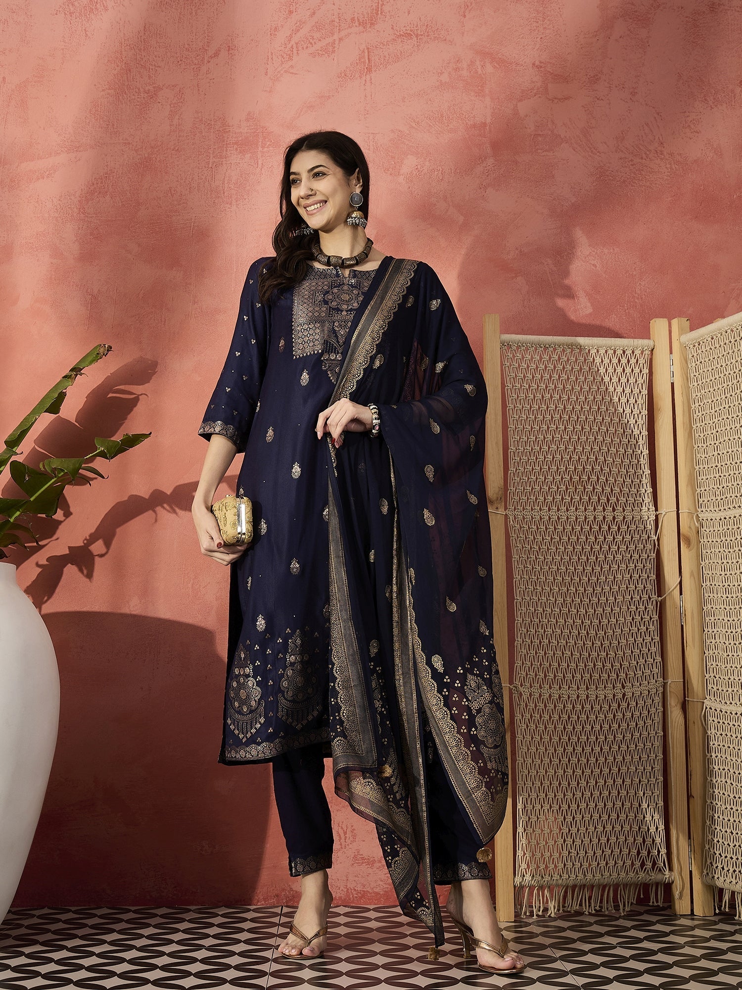 Redefine elegance with this Women Embroidered Straight Round Neck Kurta & Trousers with Dupatta, crafted for a refined and graceful look. Made from soft rayon fabric, this kurta set features a subtle self-design pattern that adds understated charm. The round neckline and straight-fit silhouette offer a timeless appeal, while ensuring comfort throughout the day. Paired with matching trousers and a lightweight chiffon dupatta, this ensemble is perfect for everyday elegance as well as special occasions.