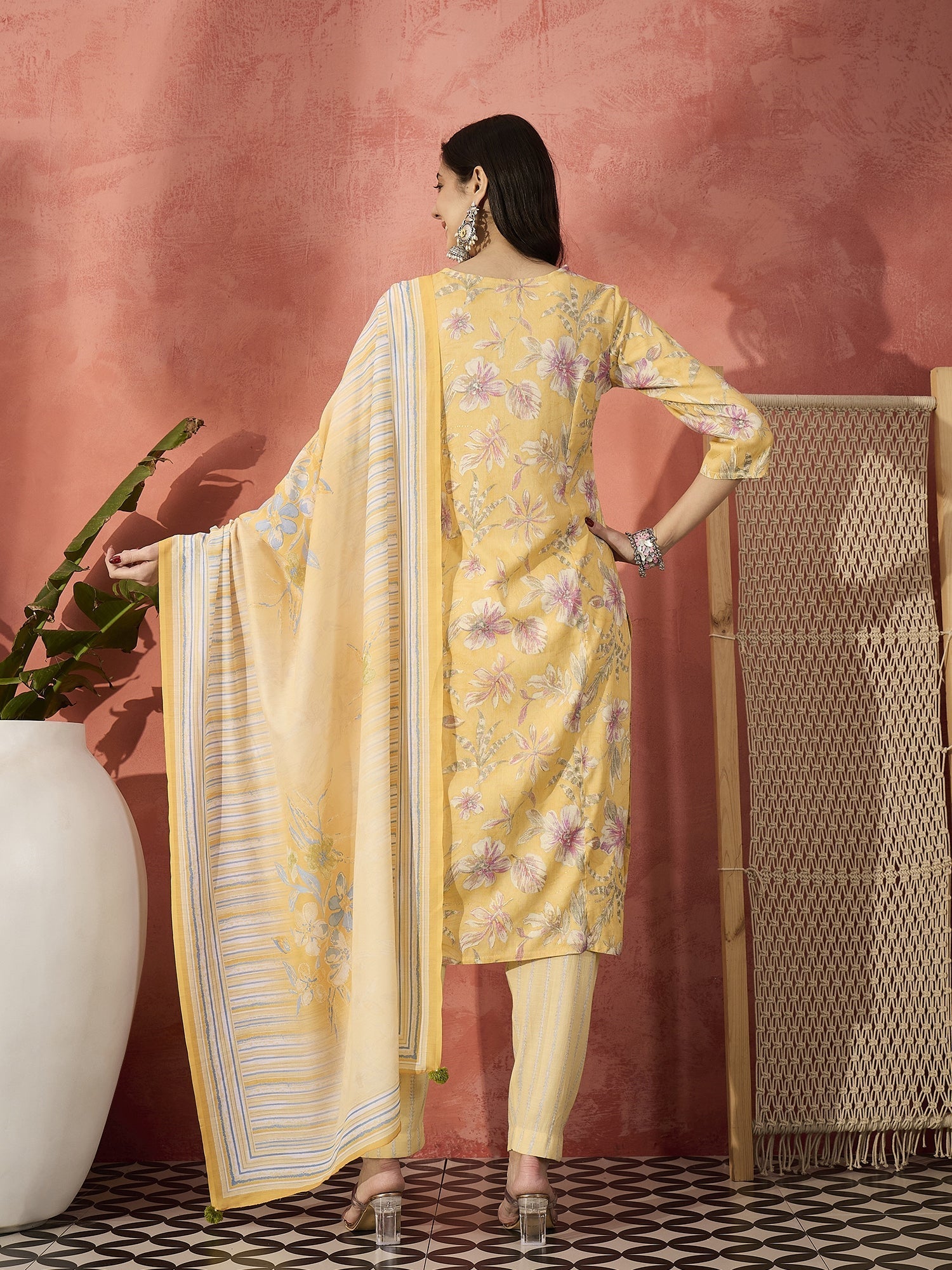 Make a statement with this elegant Women Yellow Floral Embroidered Notch Neck Straight Kurta Set with Trousers and Dupatta, designed to offer timeless charm and refined style. Crafted from soft rayon fabric, the kurta features delicate floral embroidery that adds a graceful ethnic touch. The notch V-neckline and 3/4 sleeves enhance its sophisticated appeal, while the straight-fit silhouette ensures comfort and elegance. Paired with a matching rayon trouser and a rich cotton silk dupatta, this ensemble is perfect for festive occasions, office wear, and special gatherings.