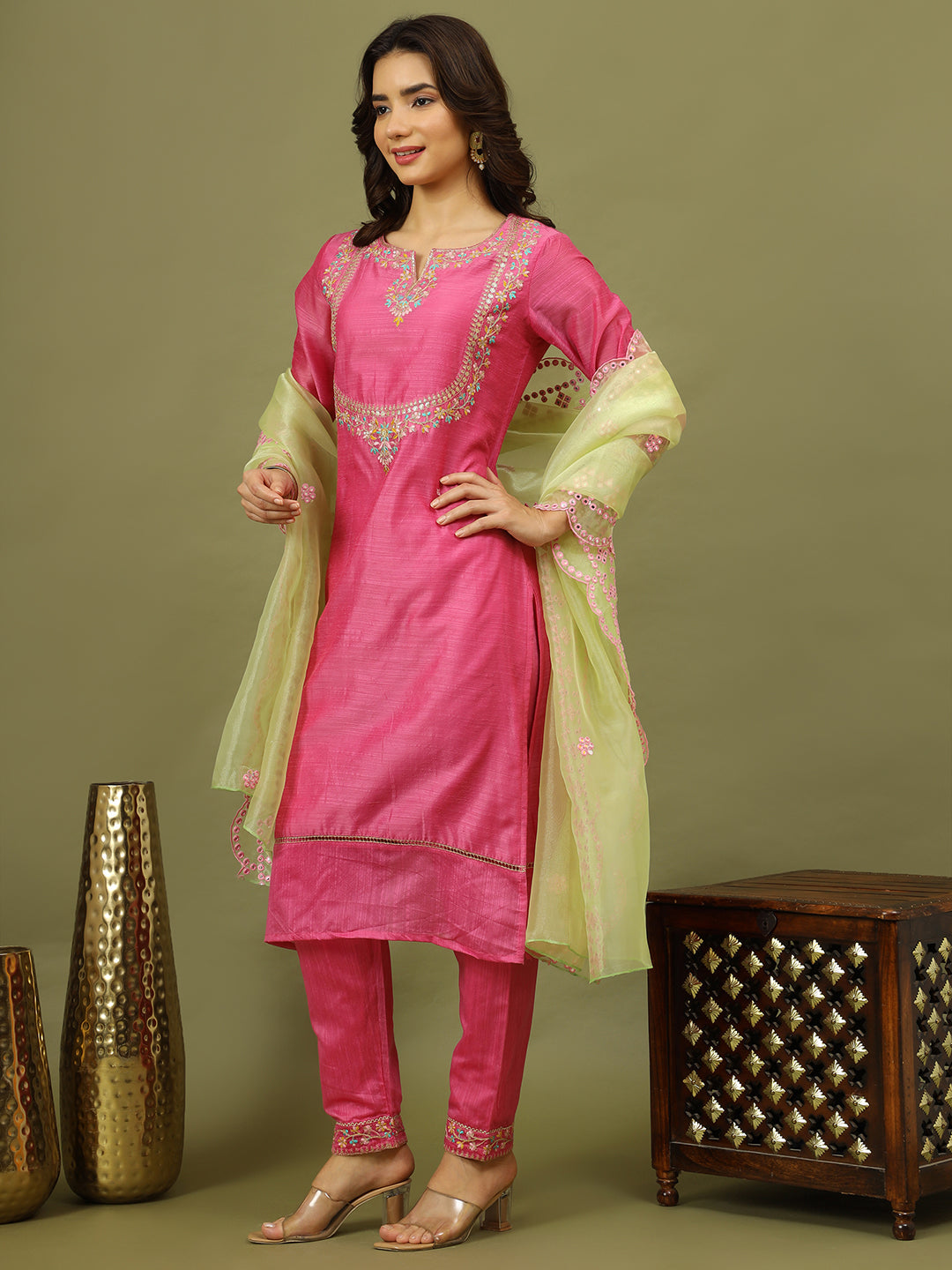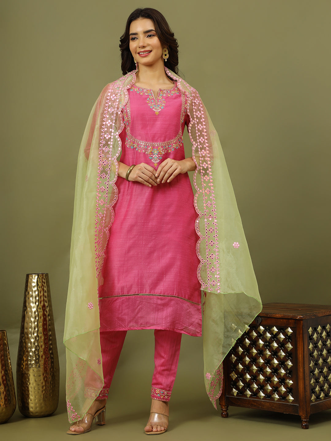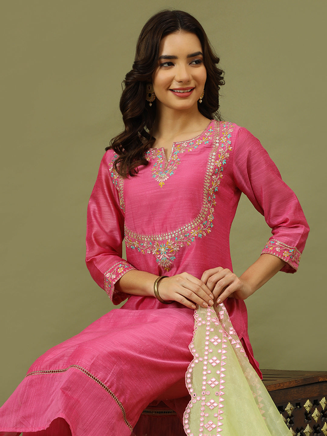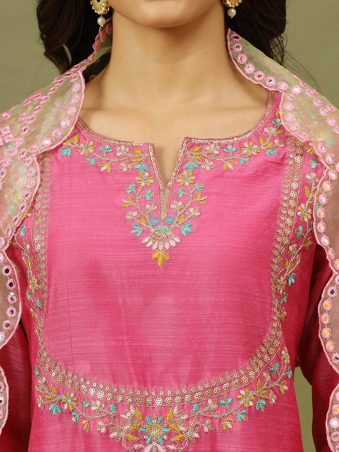Crafted from luxurious polyester, this elegant pink kurta set is designed to bring together refined craftsmanship and graceful style. The delicate floral embroidery adds a soft festive charm, making this ensemble an ideal choice for both festive and formal occasions.