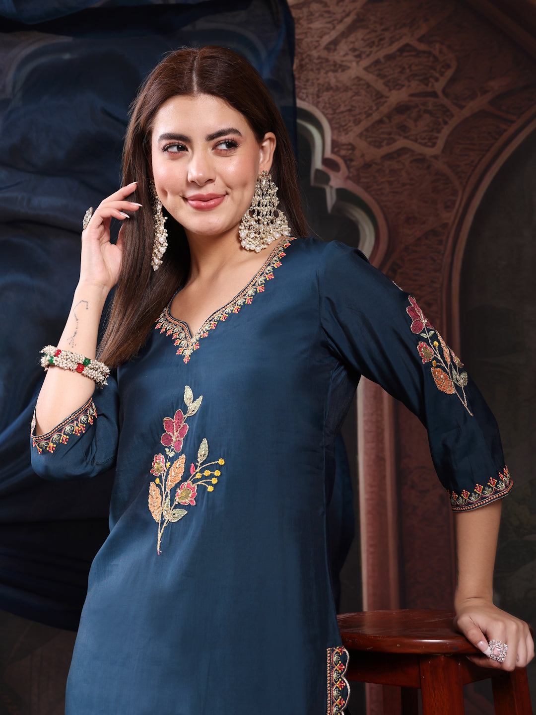 Bring elegance and charm to your ethnic wardrobe with this Teal Blue Embroidered Kurta Set from RAMA’S, featuring a matching palazzo and dupatta. Perfect for festive occasions, celebrations, or ethnic gatherings, this set combines traditional craftsmanship with modern design. The delicate embroidery enhances the rich teal blue shade, offering a graceful and sophisticated look. At RAMA’S, fashion is more than clothing—it’s a way to express your story without words.