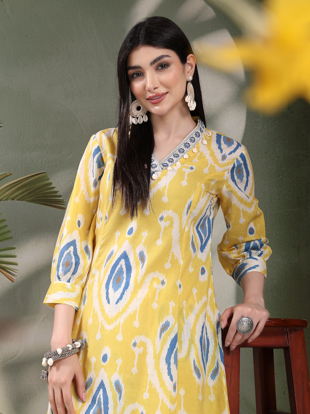 Add a touch of fresh charm to your ethnic wardrobe with this Yellow Ethnic Printed A-Line Kurta & Trousers Set. Crafted from pure cotton, the fabric is soft, breathable, and comfortable for all-day wear. The kurta features a bold geometric ethnic print with contrast accents, giving it a modern yet traditional appeal, while the A-line silhouette ensures a flattering and flowy fit. Designed with a V-neckline and 3/4 sleeves, this set strikes the perfect balance between comfort and elegance. Paired with matching cotton trousers, it is an ideal choice for office wear, casual outings, festive brunches, and relaxed evening gatherings.