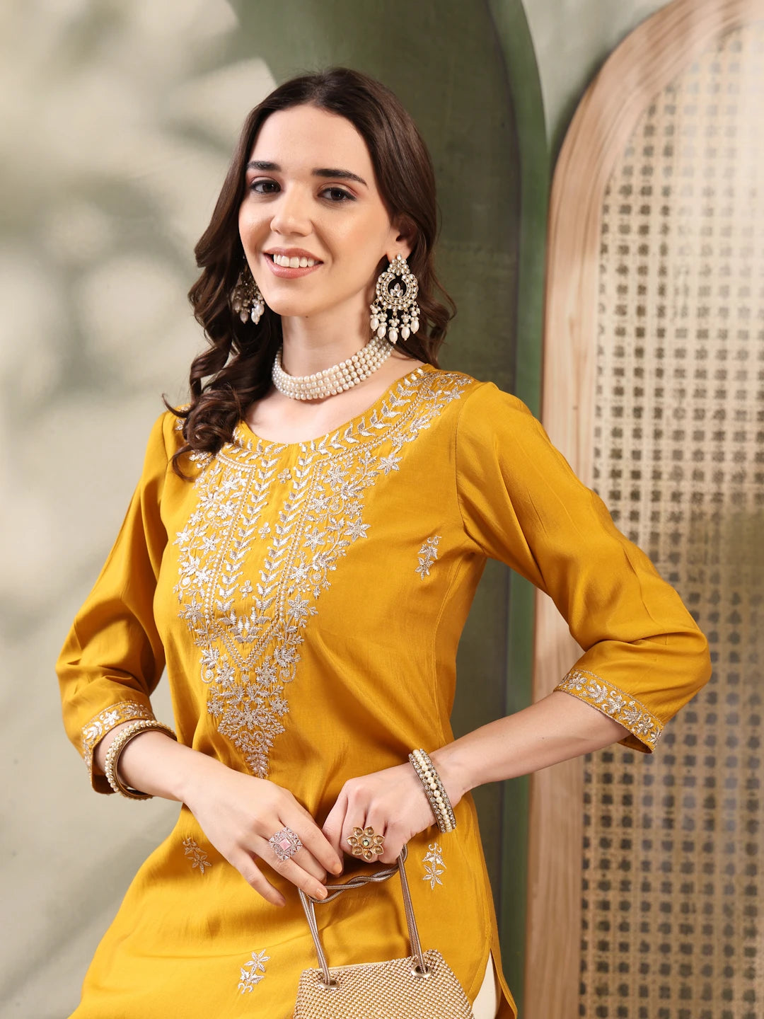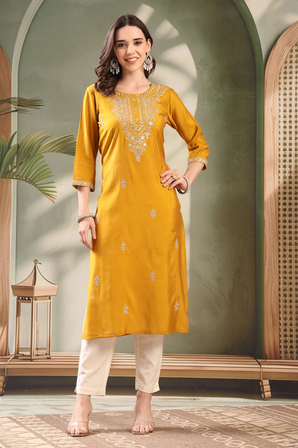 Enhance your ethnic look with this lady mustard embroidered straight kurta. Crafted with elegant thread embroidery, a classic round neck and comfortable 3/4 sleeves, this kurta offers a perfect blend of tradition and style, ideal for festive occasions, office wear and casual outings.