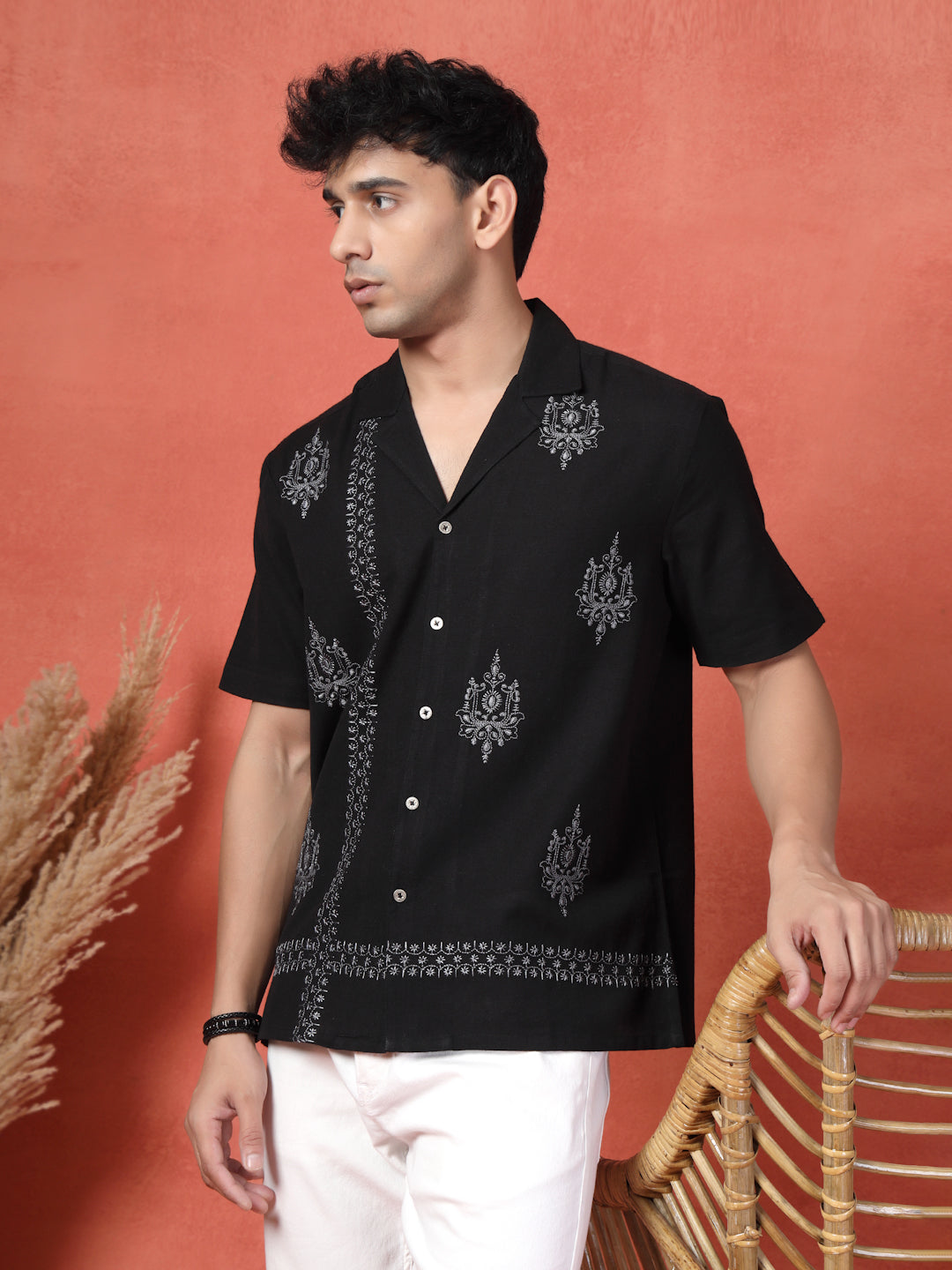 Crafted from soft, breathable cotton, this black Cuban collar shirt is detailed with intricate embroidery for a refined and contemporary look. Designed to balance timeless style with modern sophistication, it’s a versatile essential for every wardrobe.