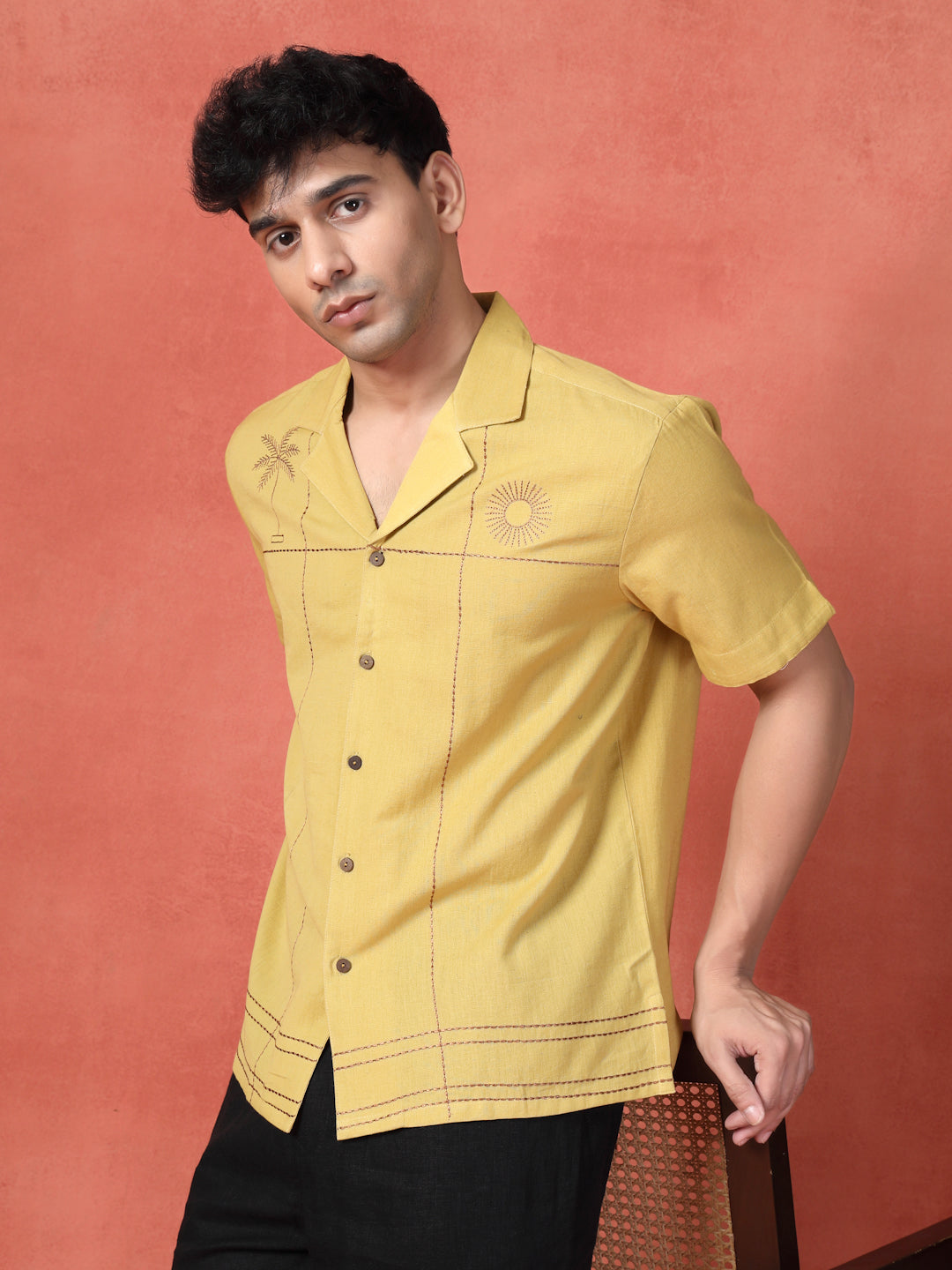 Men's Mustard Color Embroidered Cotton Cubans Collar Shirt