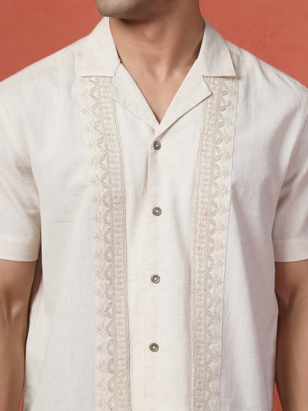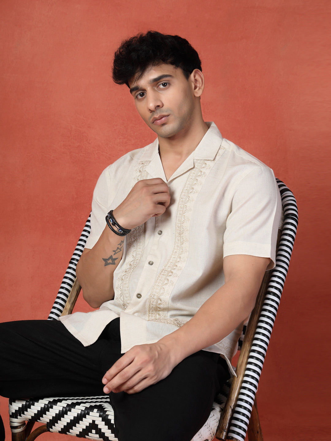 Step into effortless sophistication with this Men’s White Embroidered Cotton Cuban Collar Shirt, designed for a clean yet powerful style statement. Crafted from premium cotton fabric, this shirt features subtle embroidery that adds understated elegance. The structured Cuban collar and half sleeves create a timeless masculine silhouette, making it suitable for casual outings, festive occasions, and smart everyday wear. Comfortable, versatile, and stylish, this shirt is a must-have wardrobe essential.