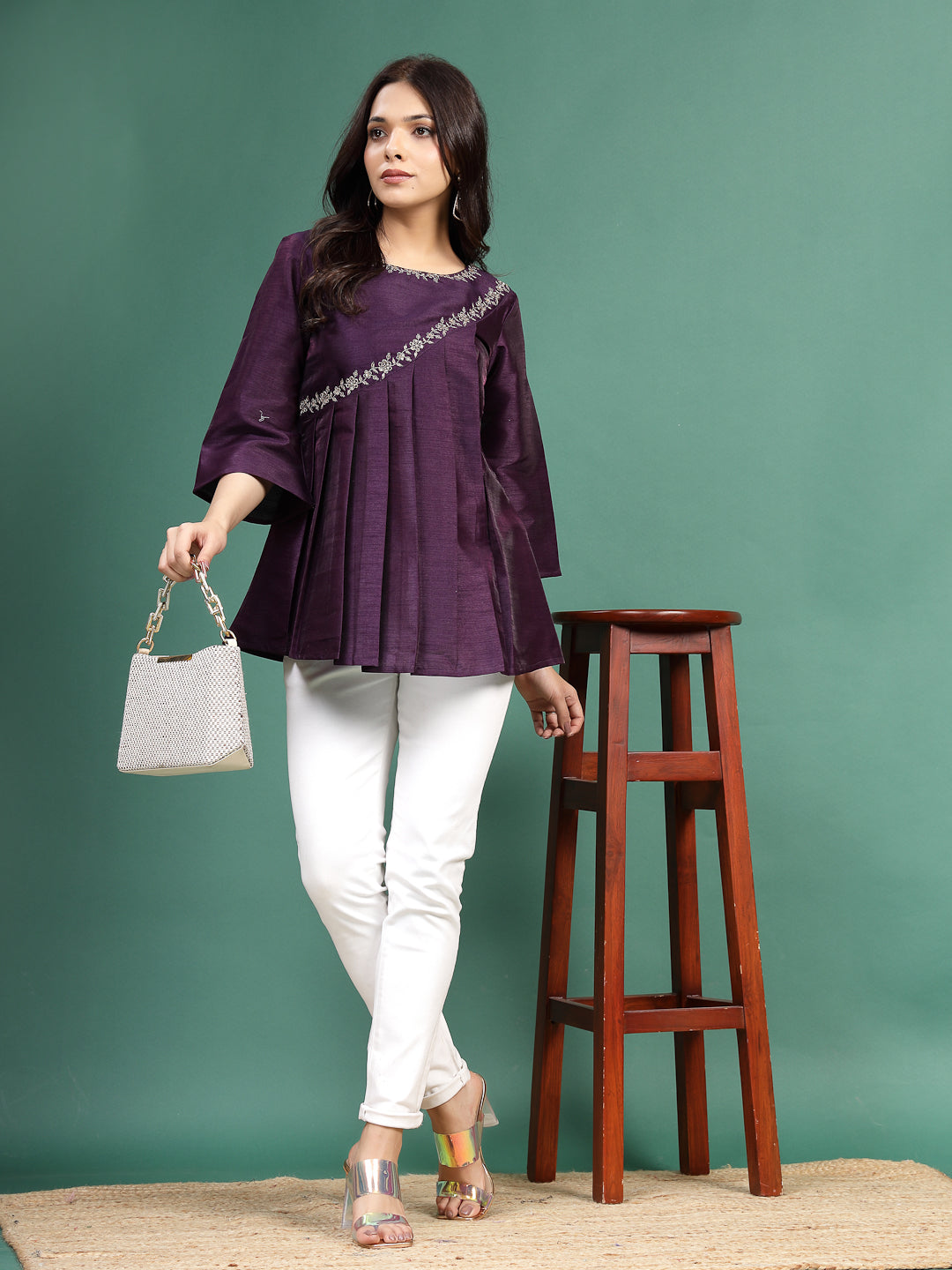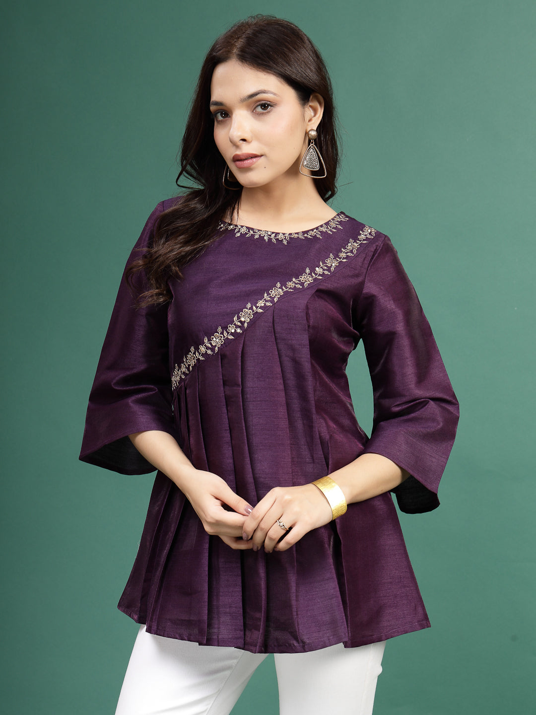Add a touch of refined elegance to your wardrobe with this Women Wine Color Floral Embroidered Pleated Top. Crafted from soft and comfortable fabric, this stylish top features a graceful pleated design that adds flow and femininity to your look.