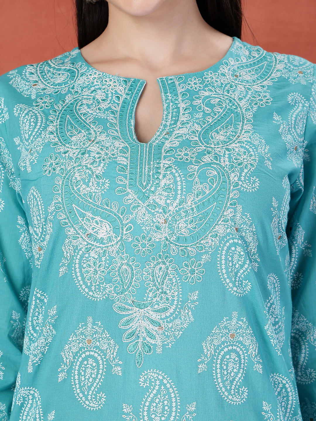 Elevate everyday elegance with this turquoise blue straight kurta featuring classic paisley prints and intricate embroidery along the neckline. Made from soft cotton fabric, it promises all-day ease while keeping your look effortlessly polished.