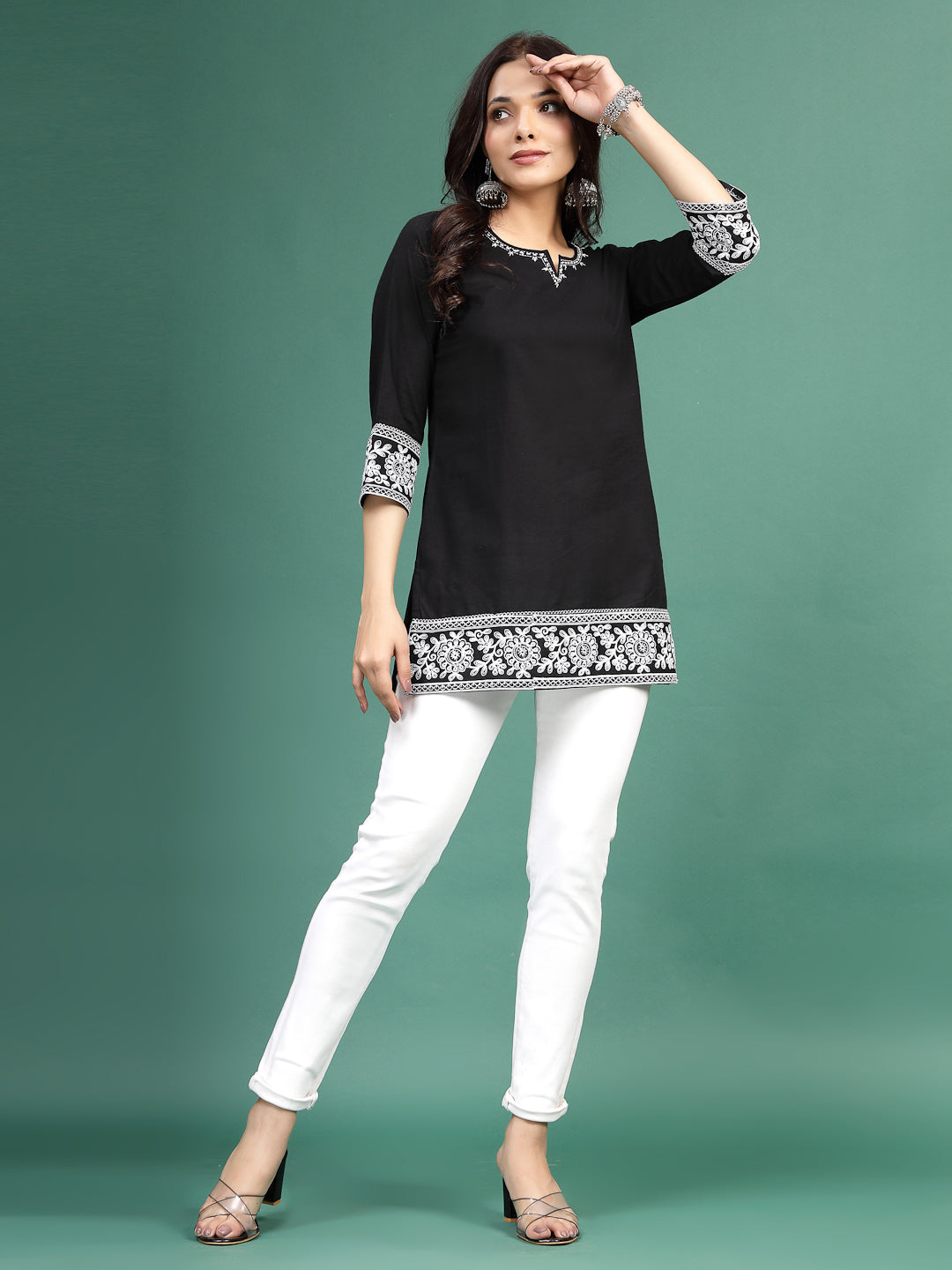 Featuring intricate embroidery, a stylish notch neckline, and 3/4 sleeves, this short kurti offers a flattering fit with a timeless appeal. The classic black color makes it a versatile choice for casual outings, office wear, and chic evening looks. A must-have staple that perfectly blends comfort with sophistication.