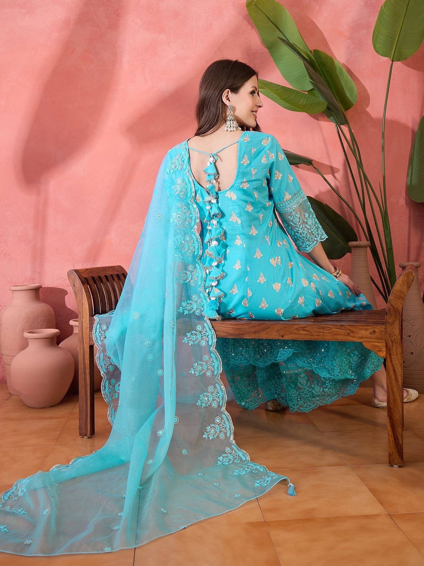 Women Turquoies Blue Embroidery Anarkali Kurta Sharara Set With Dupatta in Turquoise Blue
