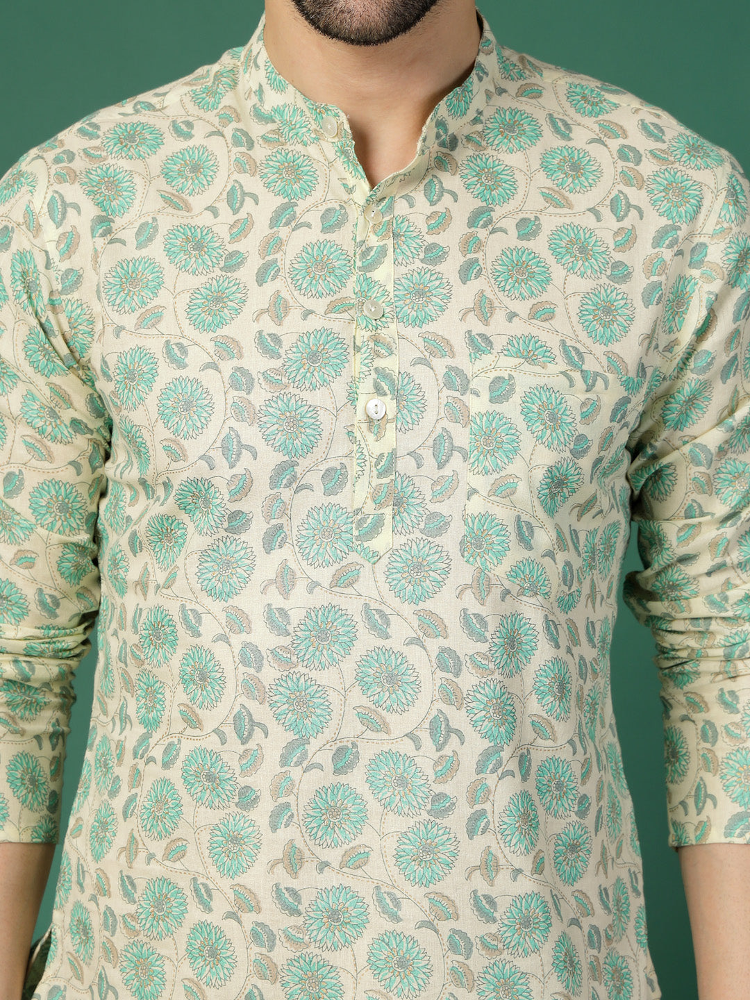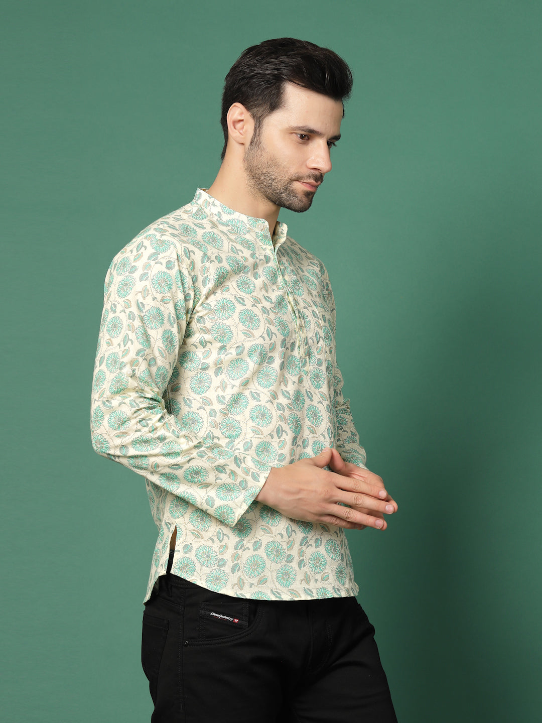 Refresh your ethnic wardrobe with this men white floral printed shirt featuring a classic mandarin collar and full sleeves. Designed with elegant all-over floral motifs, it offers a perfect blend of comfort and style, making it ideal for festive occasions, casual outings and modern ethnic wear.