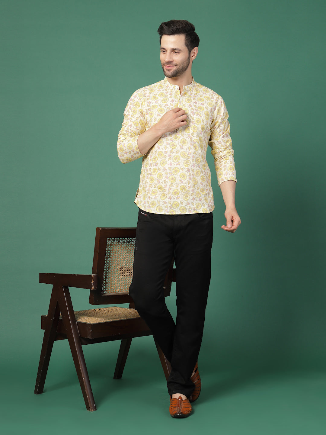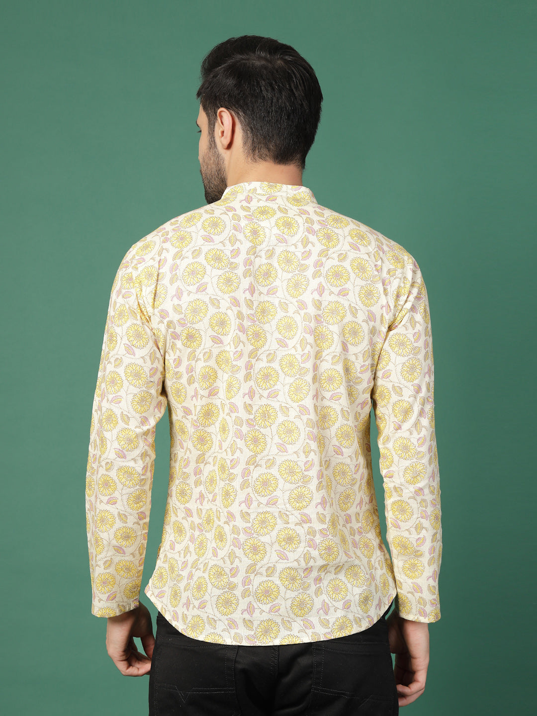 Add charm to your ethnic wardrobe with this men white floral printed shirt featuring yellow motifs and a smart mandarin collar. Designed with full sleeves and elegant all-over prints, it offers comfort with style, making it ideal for festive functions, casual outings and modern ethnic looks.
