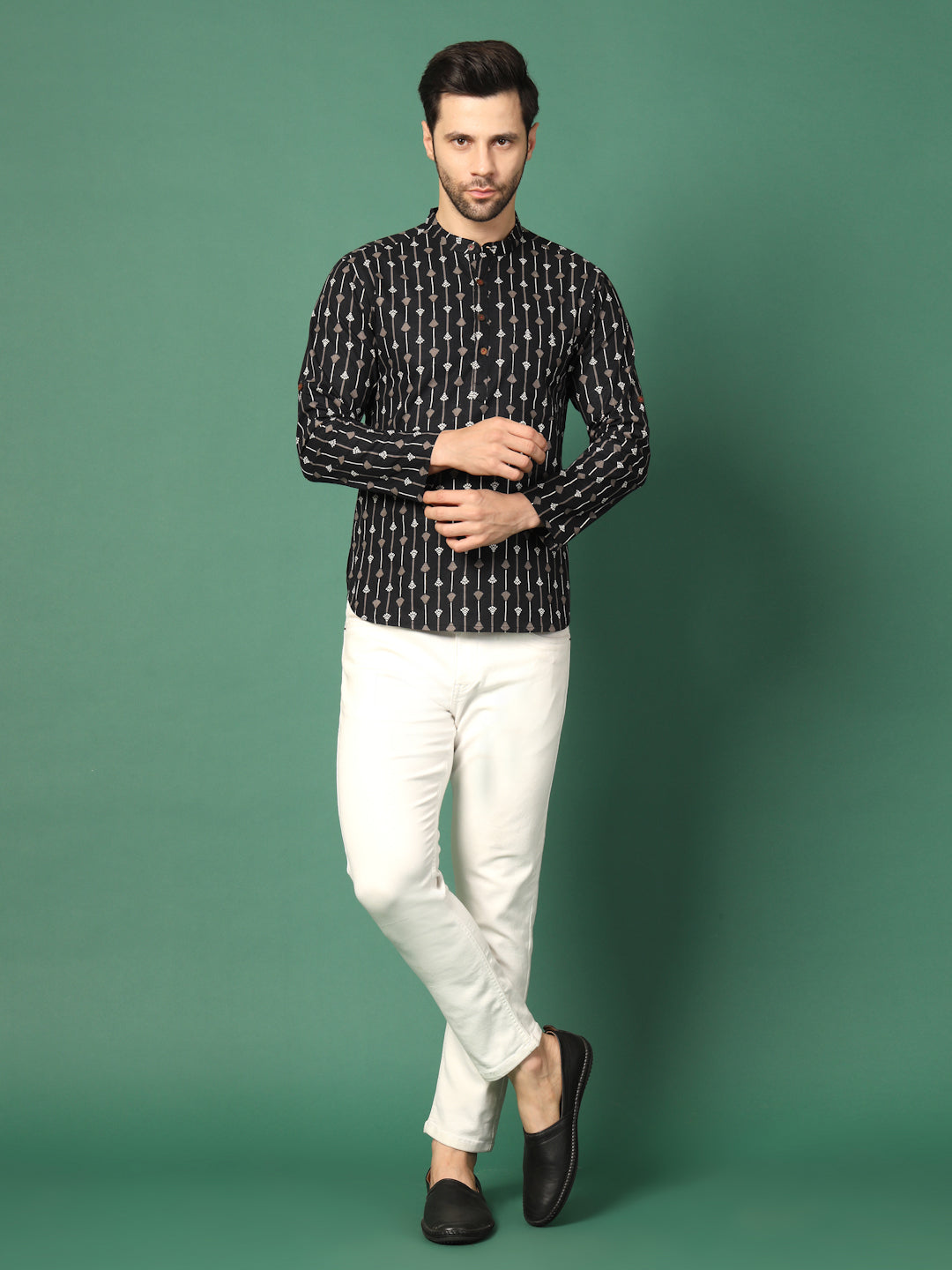 Men's Black Printed Mandarin Collar Full Sleeve Kurta