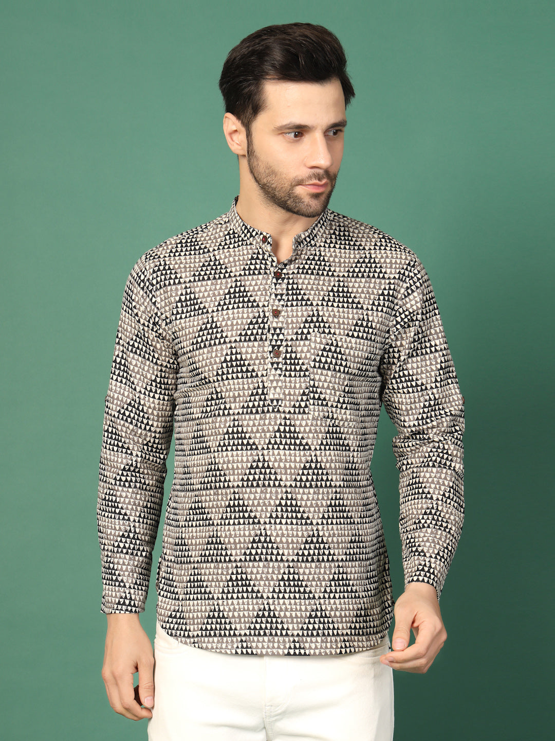 Men's Grey Printed Mandarin Collar Full Sleeve Kurta