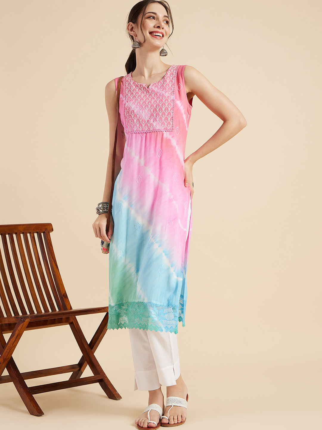 A soft pink multicolor sleeveless kurta designed with a refreshing tie-dye pattern that adds a light, playful touch to everyday ethnic styling. Crafted from breathable fabric with a relaxed straight silhouette, it offers comfort and effortless movement, making it ideal for warm-weather wear and casual outings.