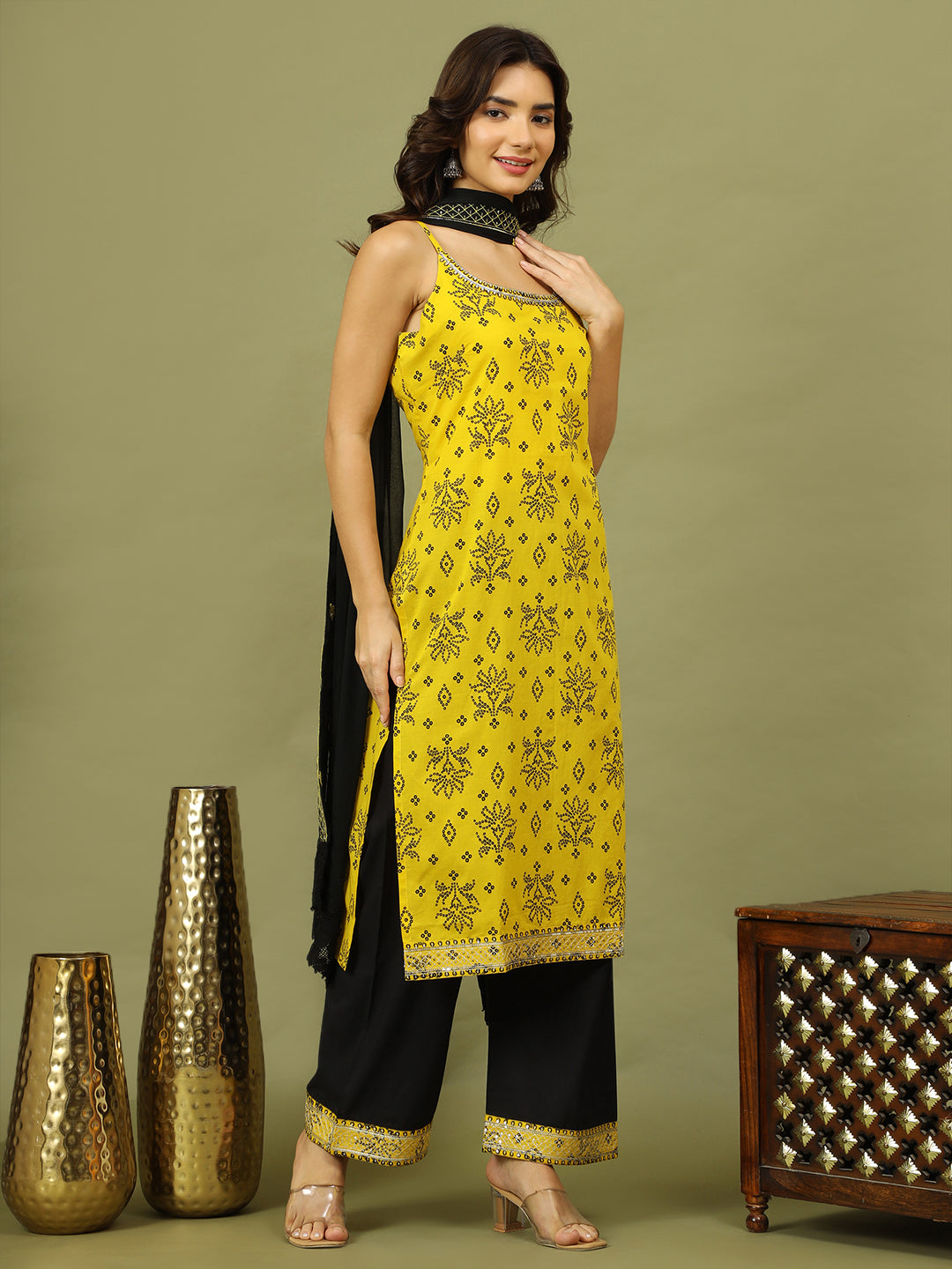 Crafted from soft, breathable cotton, this three-piece ensemble showcases a timeless Bandhani print in a rich Yellow hue—evoking the spirit of Indian artistry with a contemporary edge. The sleeveless round-neck kurta is paired with a complementing trouser and a lightweight dupatta, offering a breezy yet refined look.