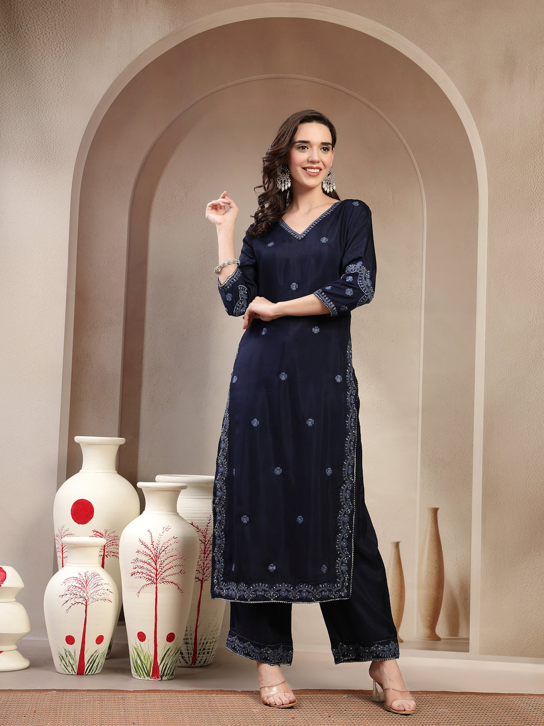 The V-neckline and 3/4 sleeves add a contemporary touch to the classic silhouette, while the easy-fit kurta and palazzo combo ensure comfort and graceful movement. Paired with a matching dupatta, this ensemble is perfect for day-to-evening transitions—from office hours to festive get-togethers.