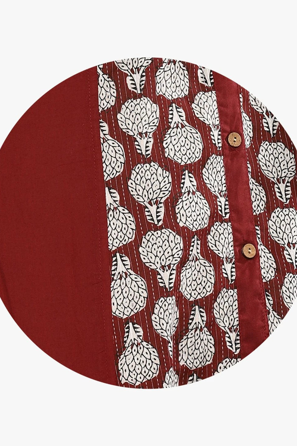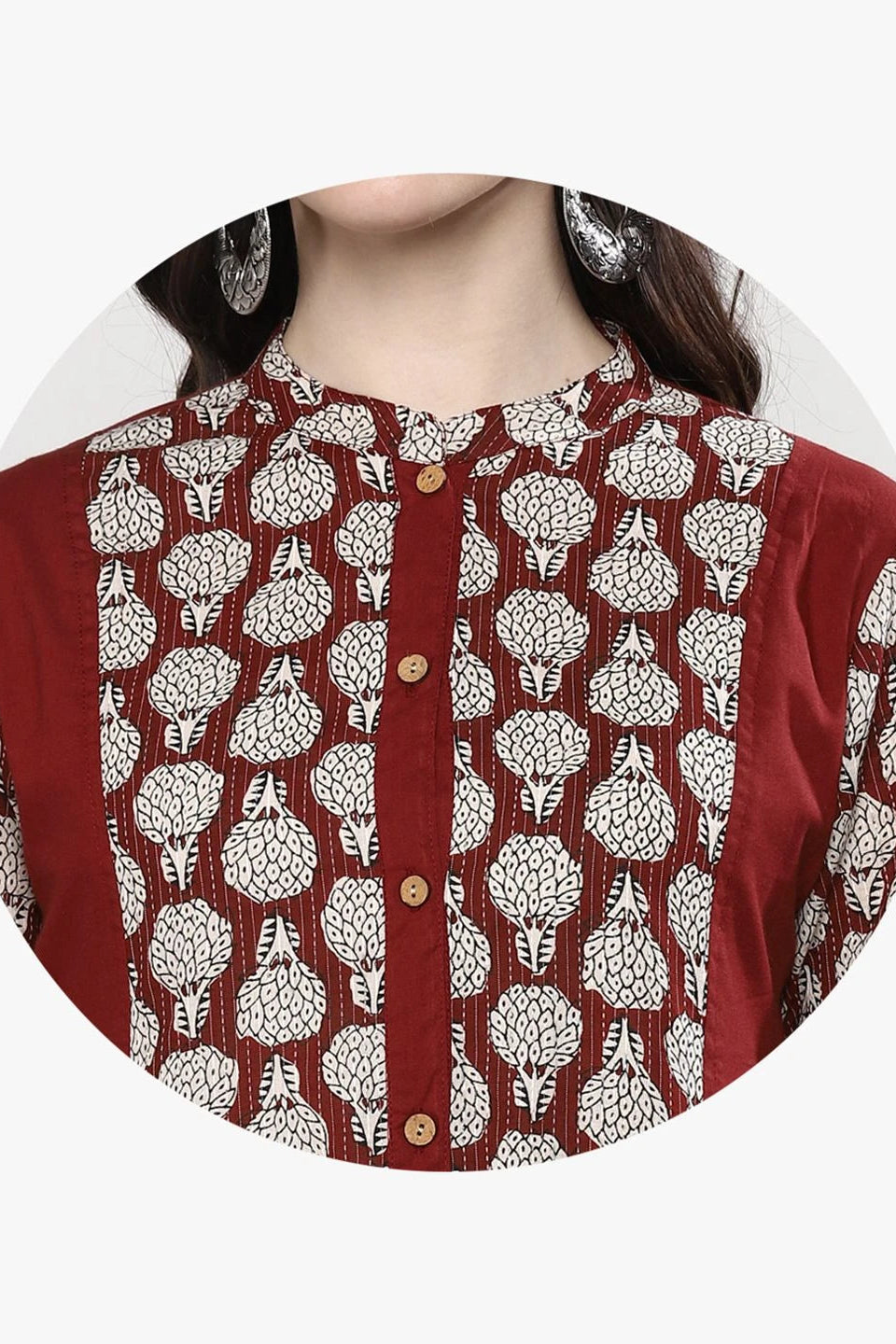Key Features• Women maroon printed A line kurta• Elegant contrast panel print design• Flattering A line silhouette• Three quarter sleeves styling• Soft and breathable cotton fabric• Ideal for office and daily wear• Comfortable casual ethnic look