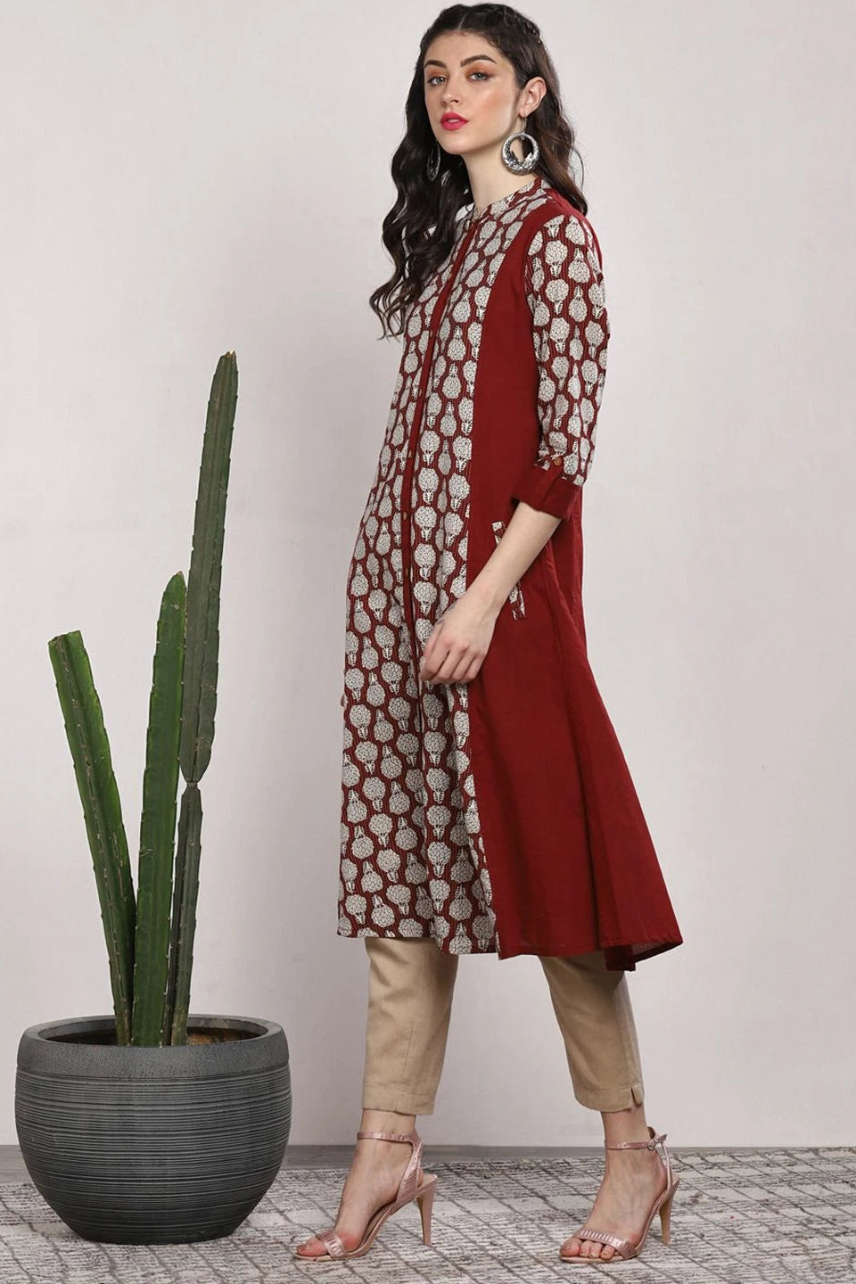Upgrade your ethnic wardrobe with this women maroon printed A line kurta crafted in breathable cotton fabric. Featuring elegant contrast panel prints and a comfortable silhouette, it is perfect for office wear, casual outings and daily traditional styling.