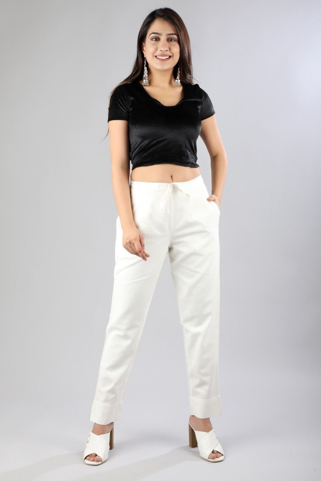 Women Off white Regular Cotton Trousers