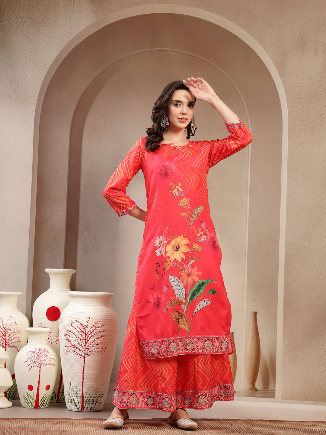 Designed with a flattering V-neckline and comfortable 3/4 sleeves, the kurta pairs effortlessly with the matching palazzo pants and a lightweight dupatta—creating a look that is vibrant, polished, and celebration-ready.