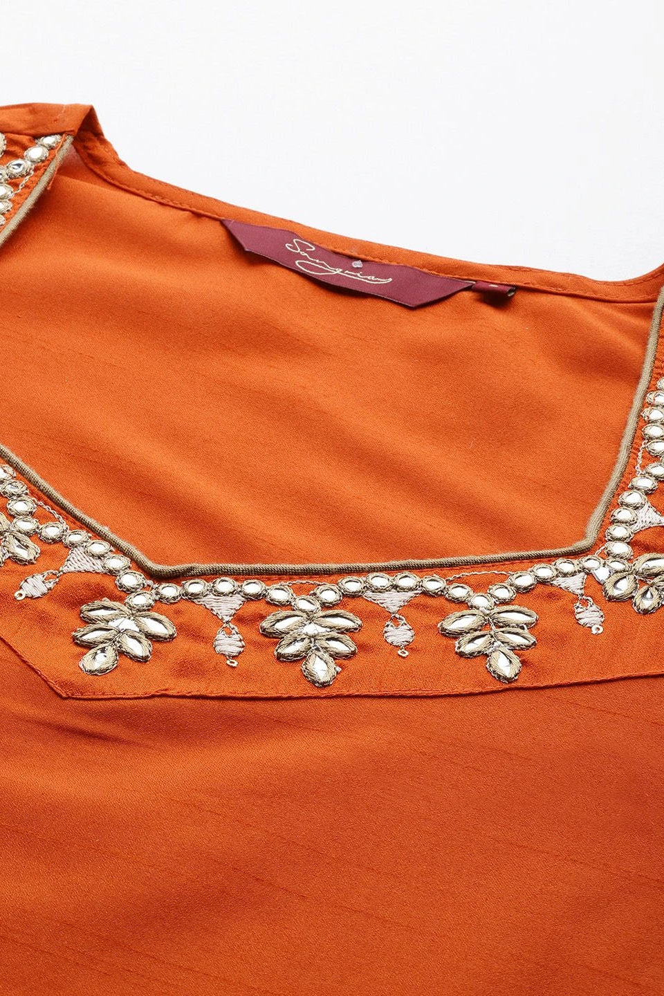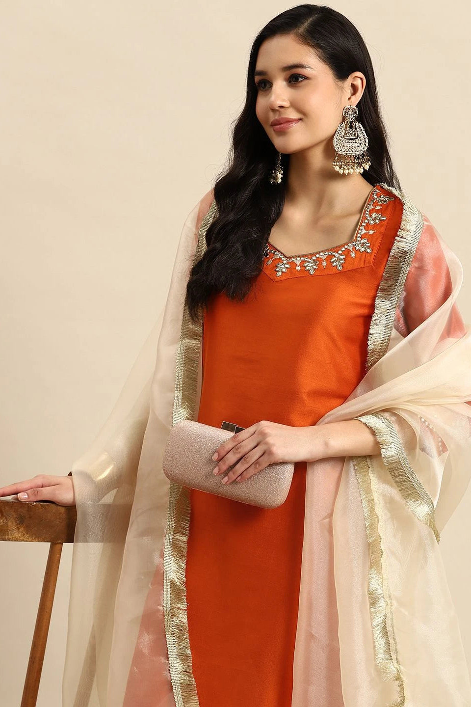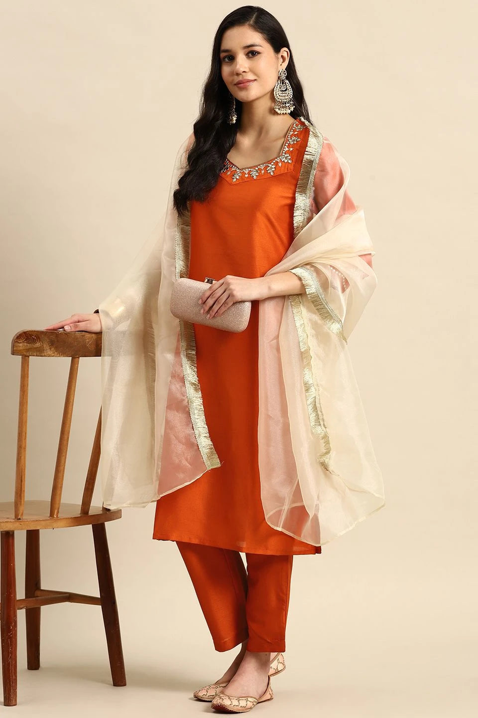 Key Features• Women orange embroidered kurta set• Premium silk fabric texture• Elegant neckline embroidery work• Matching trouser and dupatta• Comfortable straight fit silhouette• Ideal for festive and wedding wear• Rich traditional ethnic look