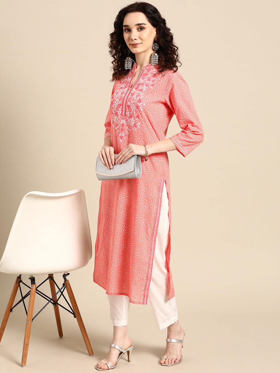 Add grace to your wardrobe with this women pink embroidered straight kurta crafted in soft breathable cotton. Featuring a flattering silhouette and subtle embroidery, it is perfect for office wear, casual outings and everyday ethnic comfort.
