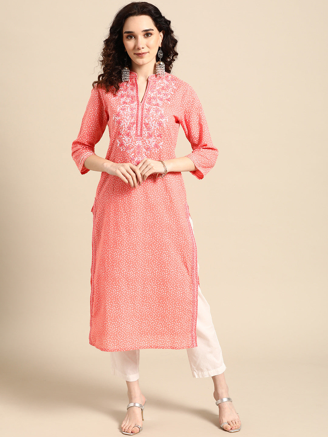 Key Features• Women pink embroidered straight kurta• Elegant front embroidery detailing• Soft and breathable cotton fabric• Three quarter sleeves styling• Comfortable everyday ethnic wear• Suitable for office and casual wear• Lightweight all day comfort outfit