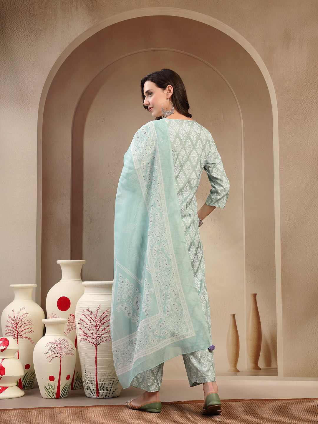Women Sea Green Polyester Kurta Trouser & Dupatta Set