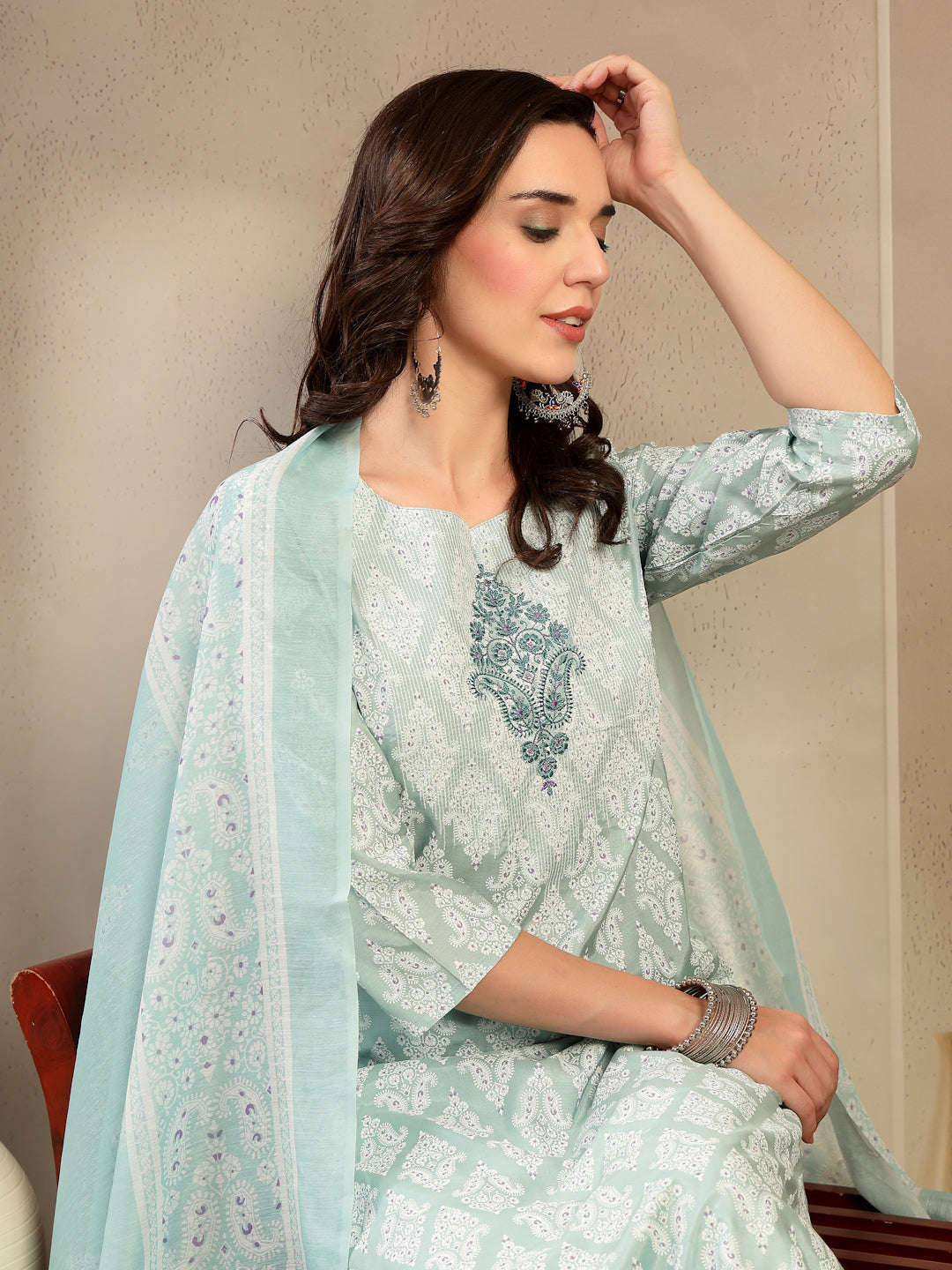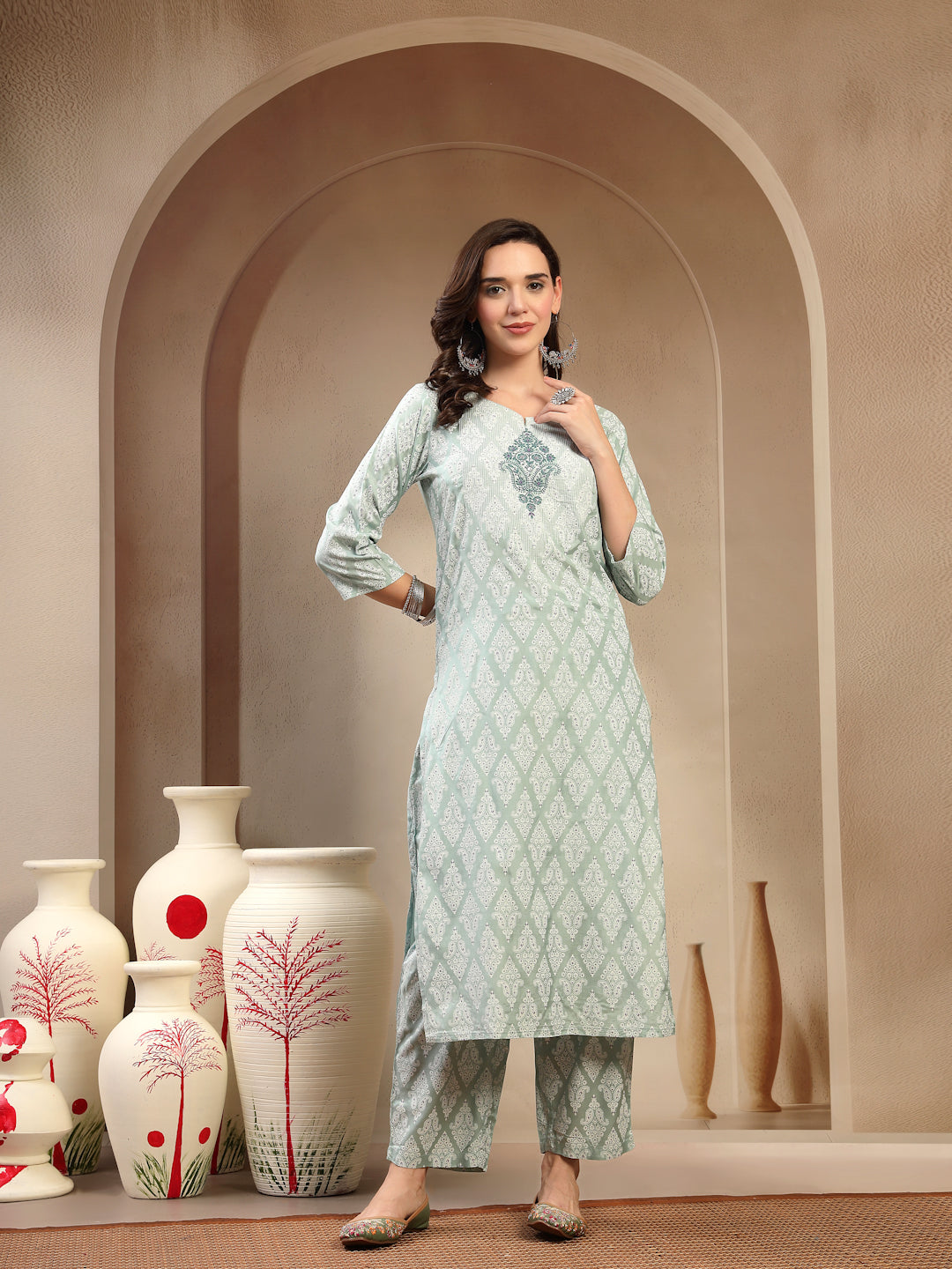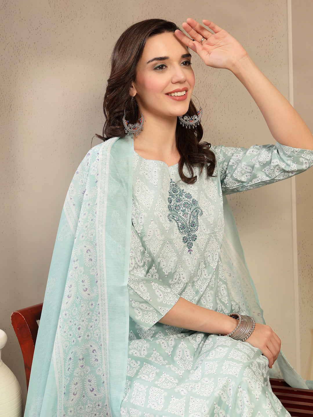 Women Sea Green Floral Printed Thread Work Notch Neck Pure Cotton Straight Kurta