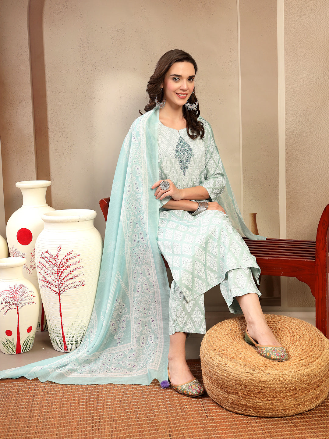 Women Embroidered Straight Round Neck Kurta & Trousers With Dupatta