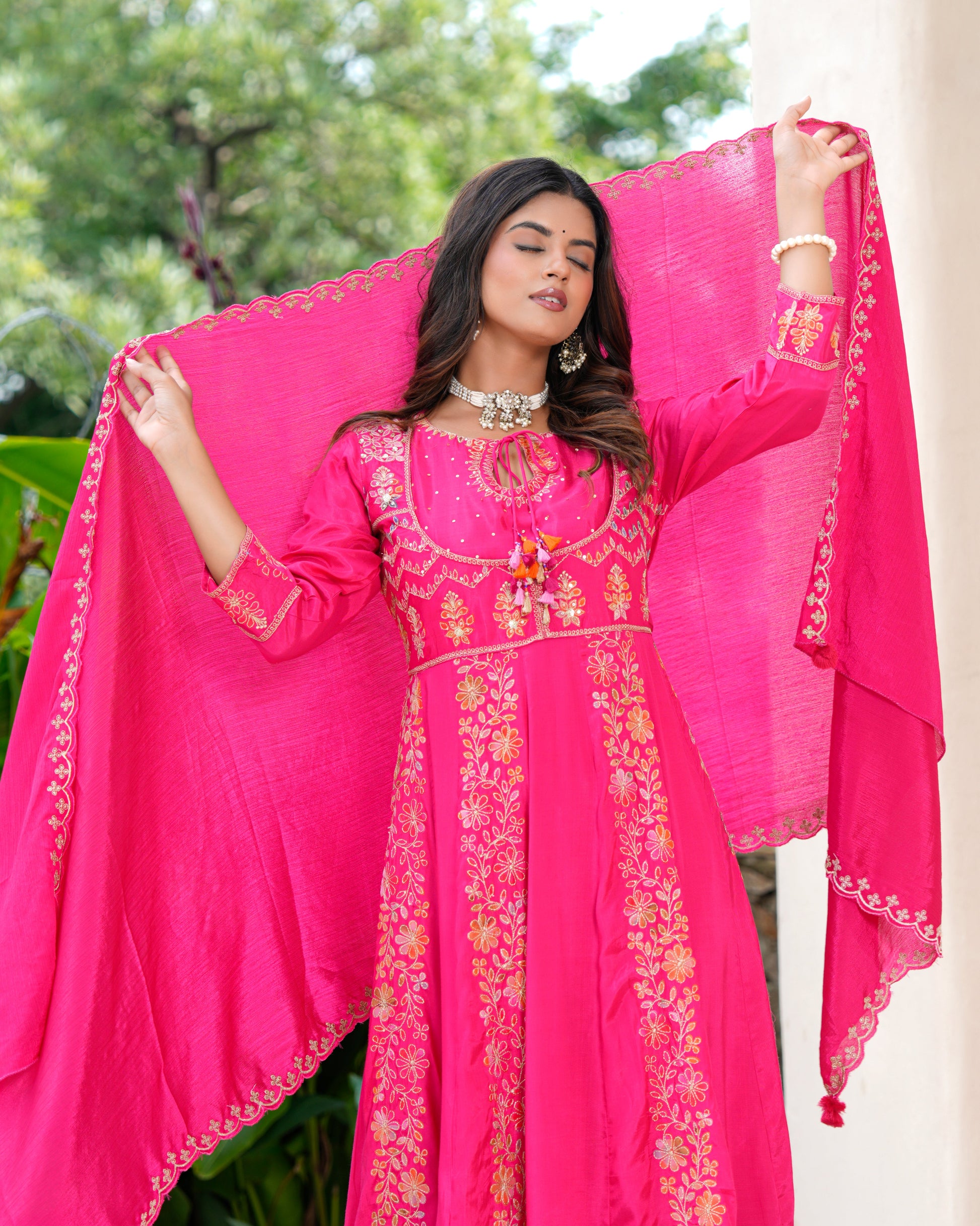 Womens Pink Color Embroidery Anarkali Kurta Trouser With Dupatta