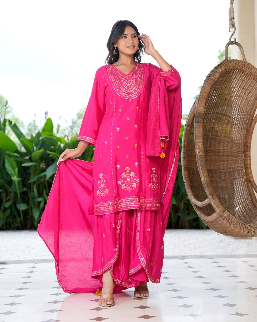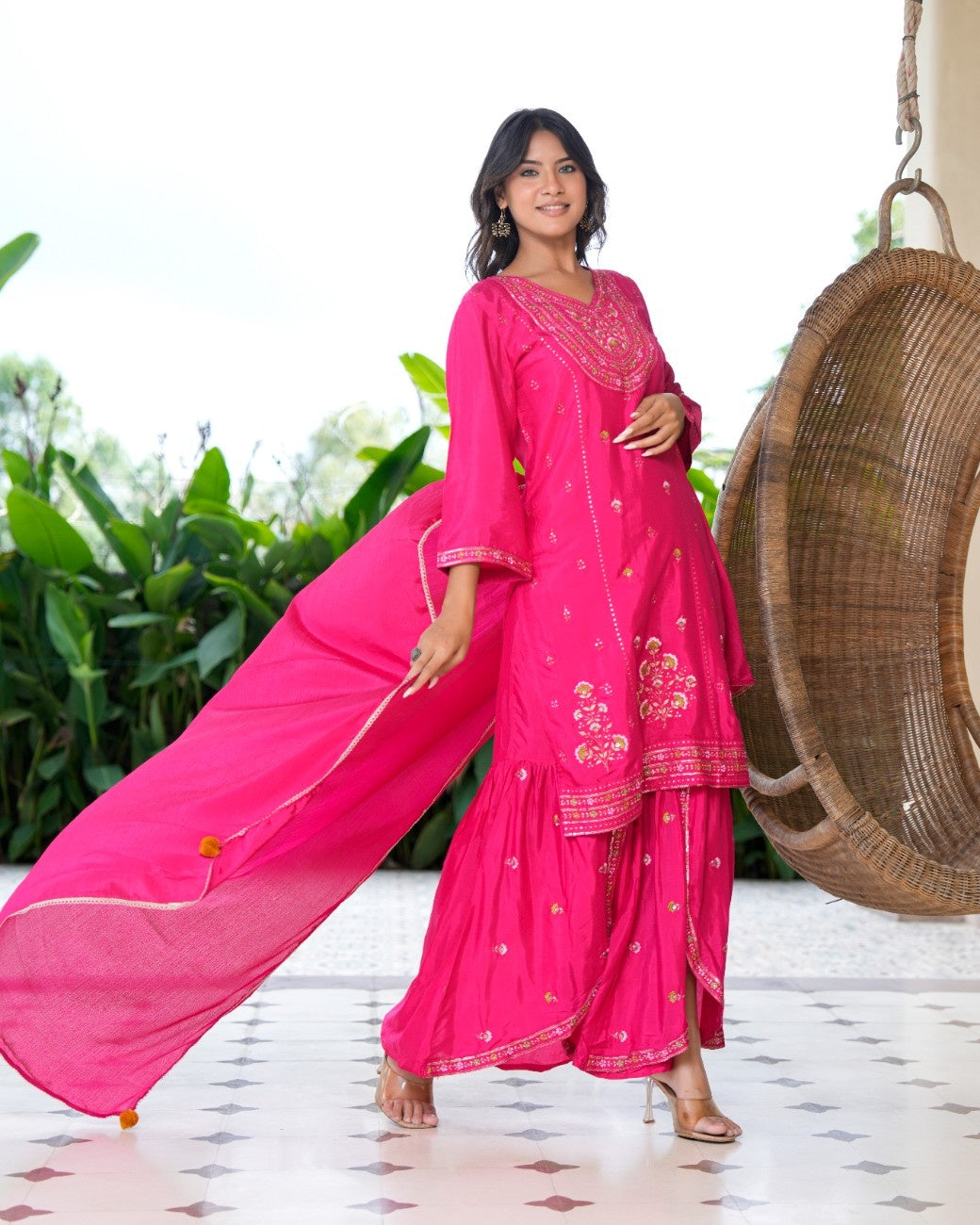 Womens Pink Color Embroidery Staright Kurta Sharara With Dupatta Set
