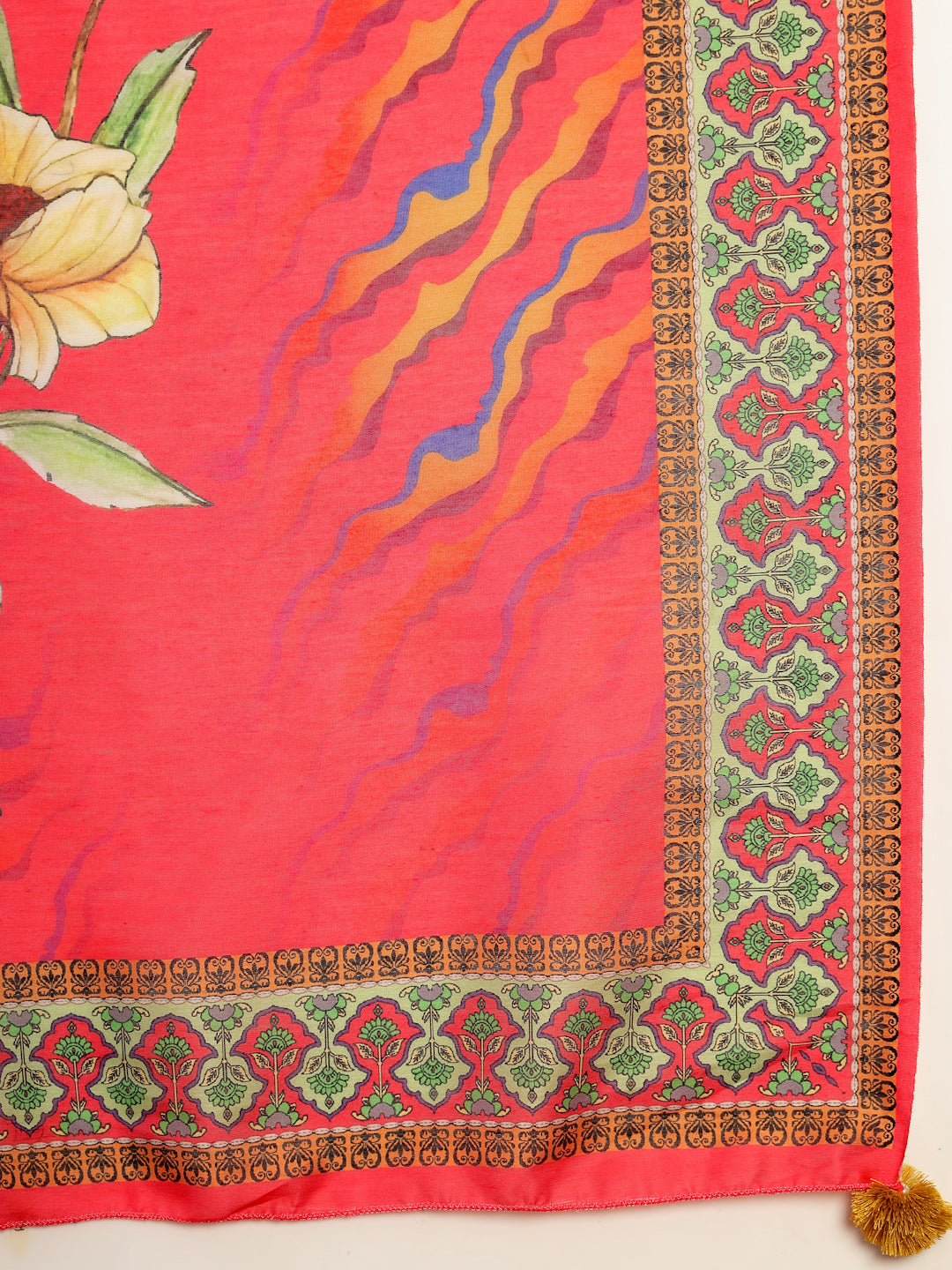 Women Mustard Floral Embroidered Notch Neck Straight Kurta With Trousers And Dupatta
