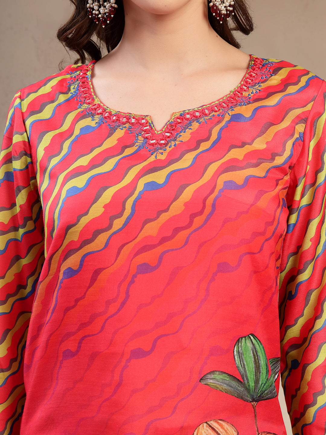 Crafted in lightweight polyester for effortless drape and comfort, this elegant ensemble showcases the iconic Lehriya print, accentuated with delicate embroidery detailing that adds a festive sparkle to your look. The V-neckline and 3/4 sleeves lend a flattering silhouette, while the coordinated palazzo pants and matching dupatta complete the outfit with fluid elegance.