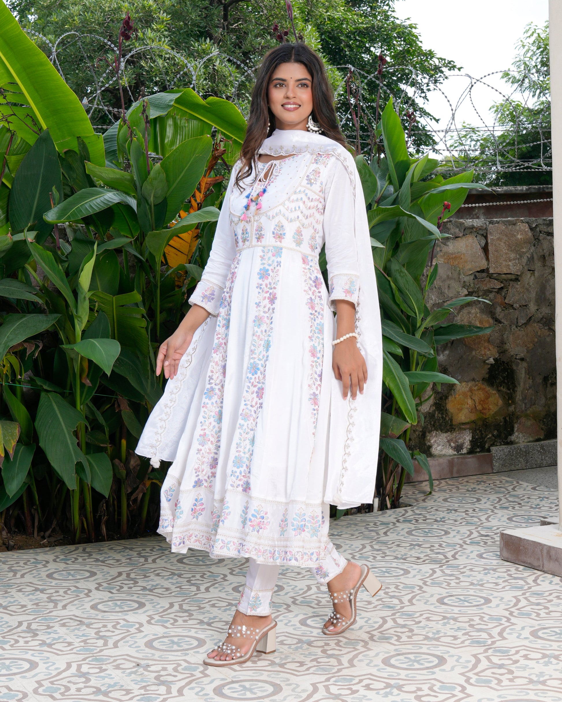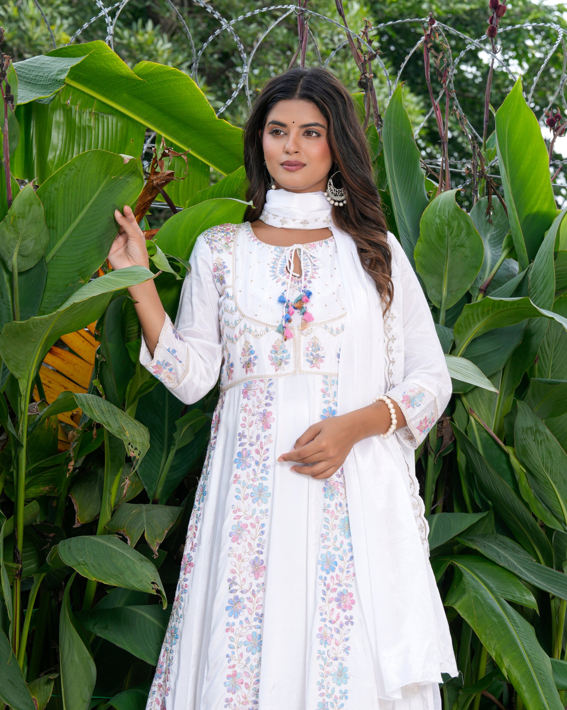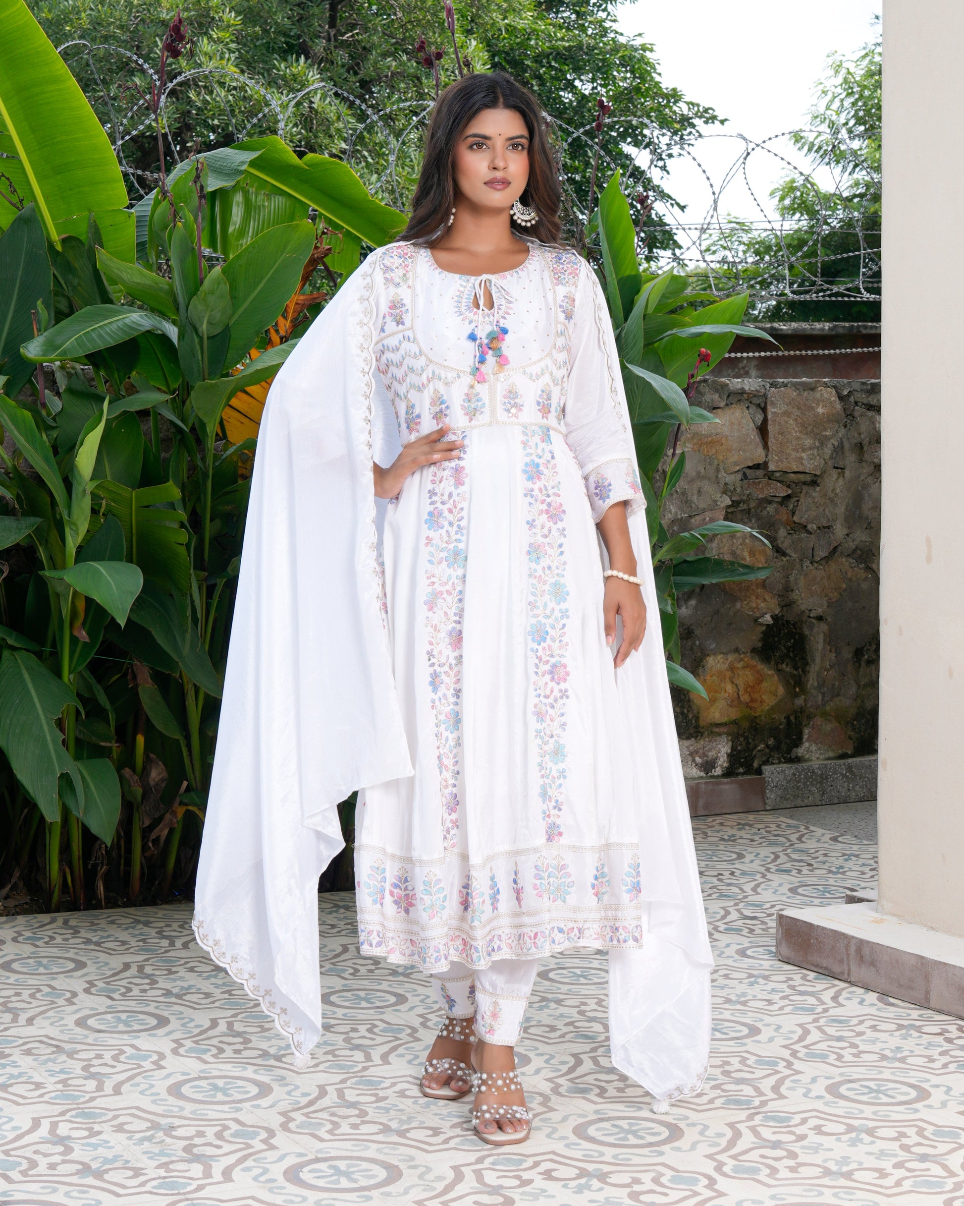 Womens White Color Embroidery Anarkali Kurta Trouser With Dupatta